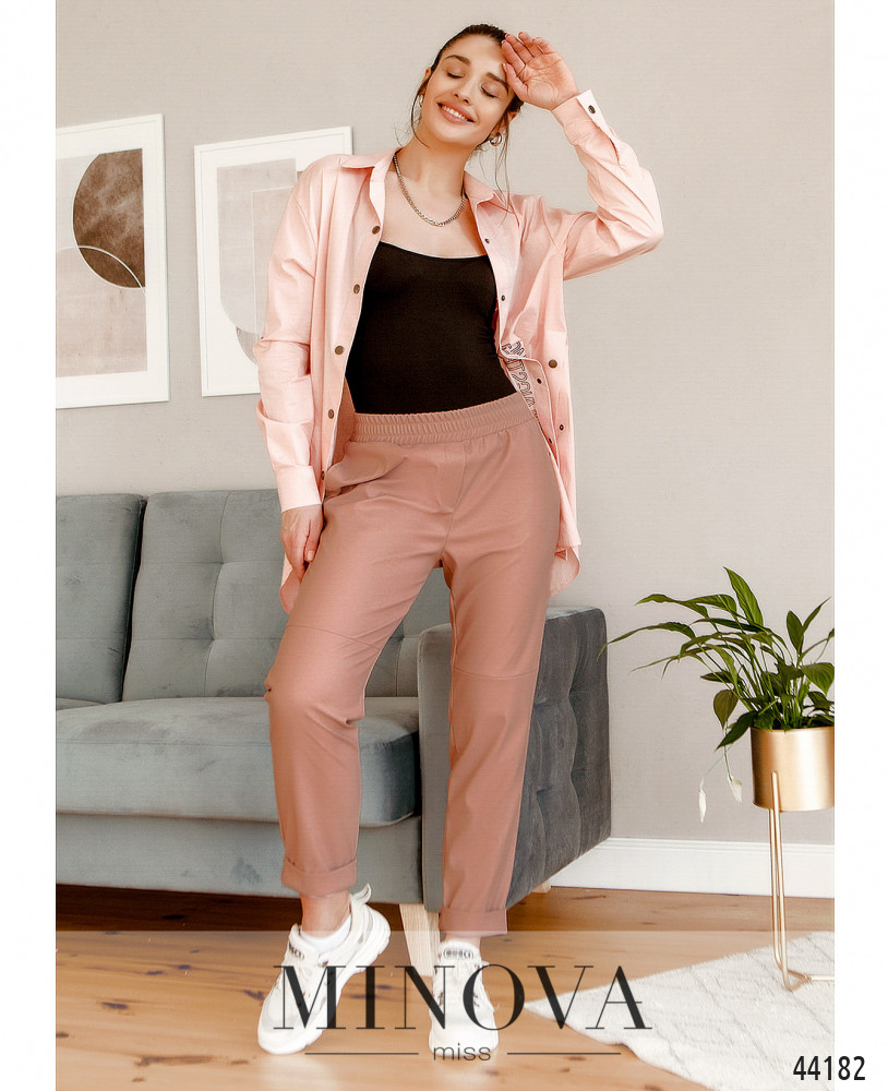Элегантные и удобные брюки с карманами в шве, в пояс вшита резинка, изнутри - гладкий подкладочный слой. На бёдрах - декоративные швы, под поясом - декоративная ширинка. Снизу подвороты. Пояс НЕ входит в комплект.