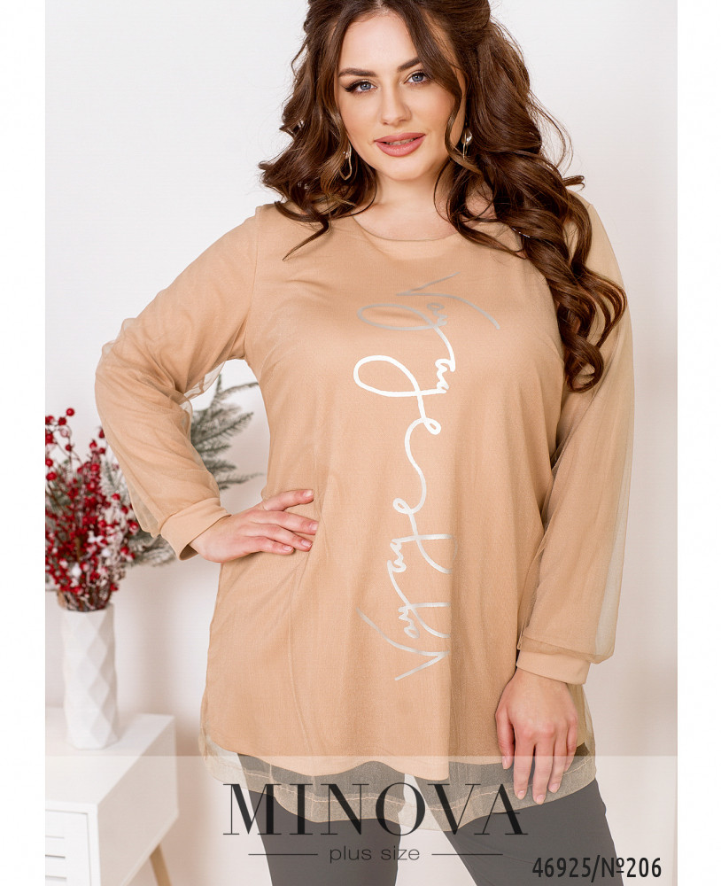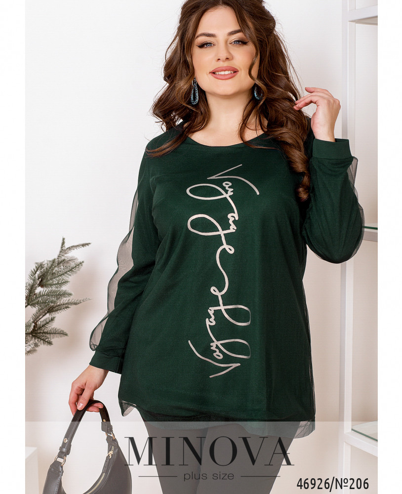 Воздушная нарядная туника хорошо садятся по фигуре, вне зависимости от ее особенностей. Двуслойная модель лаконичного кроя дополнена длинными рукавами с манжетами и ярким принтом спереди.