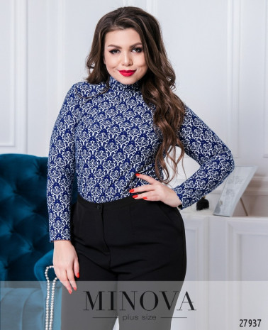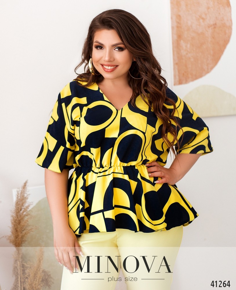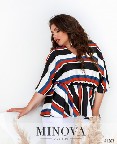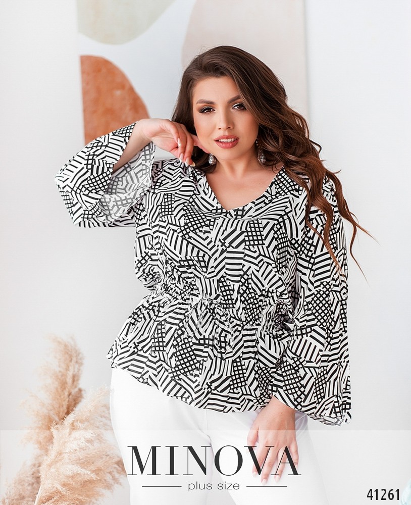 Стильная блуза батал с V-образным вырезом горловины, рукав - свободный колокол от плеча. В пояс вшита резинка и шнурок, подол асимметричный, застёжек и карманов нет.