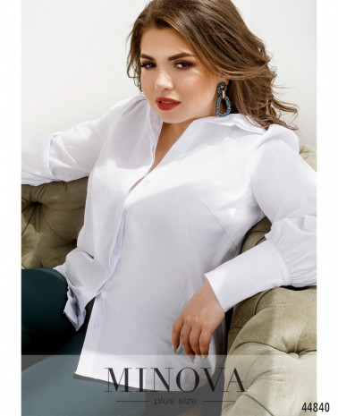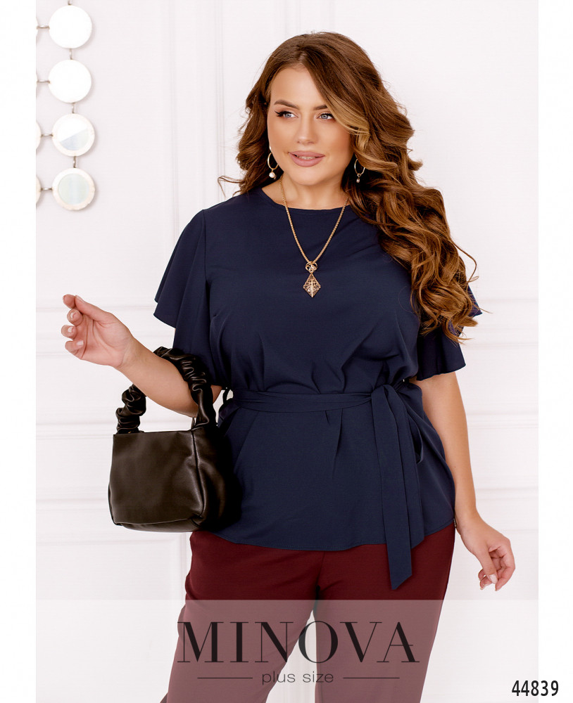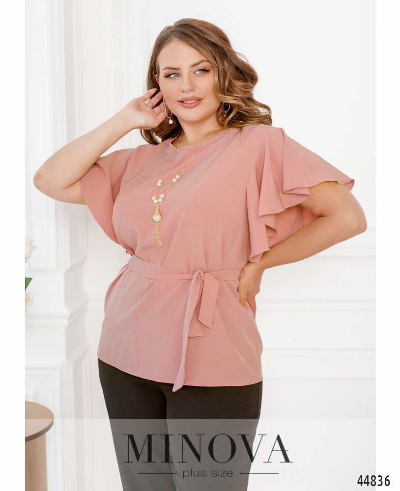 Элегантная и минималистичная блуза плюс сайз с рукавами-крылышками, ниспадающими мягкими оборками. На груди вытачки, застёжек и карманов нет, вырез горловины полукруглый. На талии по бокам подшиты шлейки для пояса.