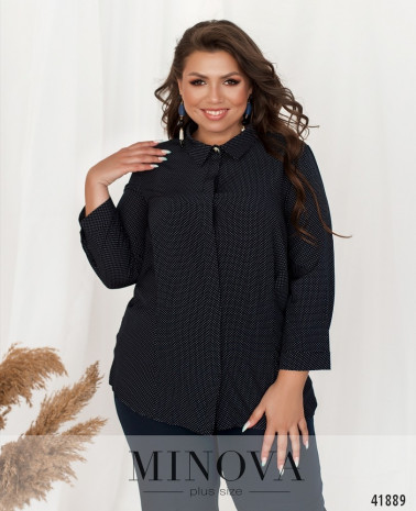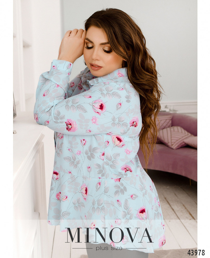 Элегантная блуза батал с нежным принтом, воротничок отложной, спереди - ряд пуговиц на планке. Рукава с манжетами, на манжетах по одной пуговке. Снизу к подолу подшиты мягкие оборки. На груди вытачки. Карманов нет.