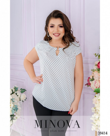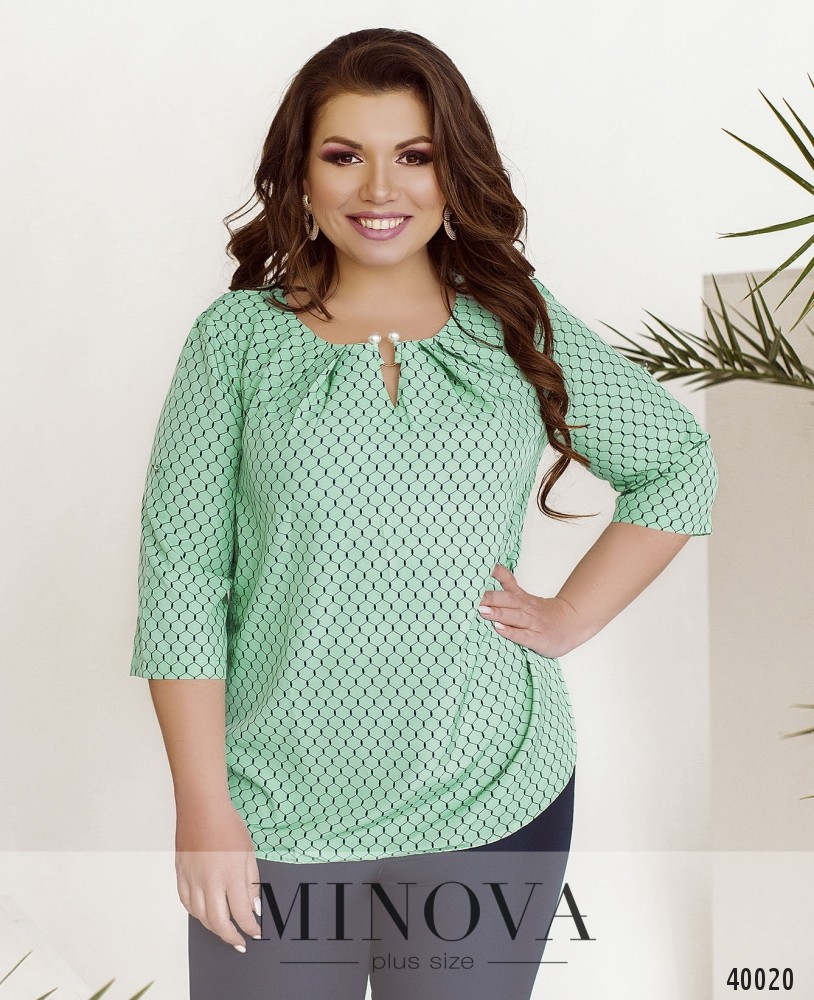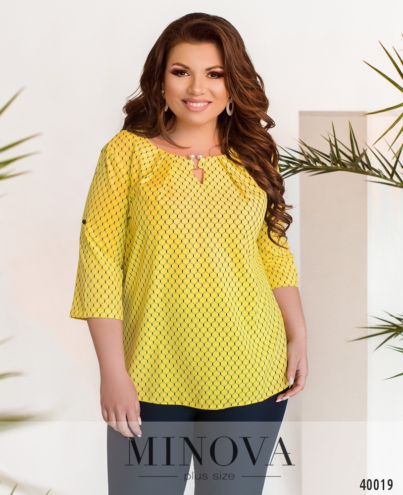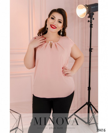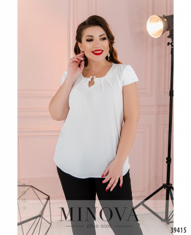 Стильна блуза великого розміру з півкруглим вирізом горловини, через виріз пропущено золотистий декоративний елемент з \"перлинними\" набалдашниками. Рукава регулюються на гудзик та стрічку. Тканина під вирізом горловини призібрана декоративними складками. Без застібок і кишень.