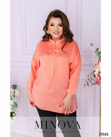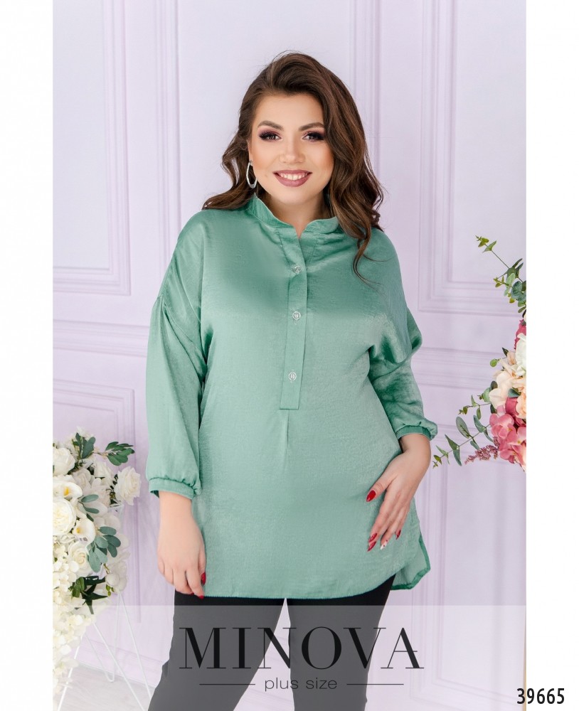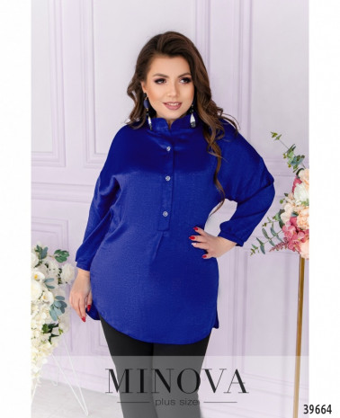 Жіночна сорочка великого розміру з комірцем-стійкою, застібається на ряд гудзиків спереду на планці, до грудей. Рукава з невеликими манжетами, без гудзиків. Поділ асиметричний, по спинці трохи довше. З боків подолу - невеликі розрізи.
