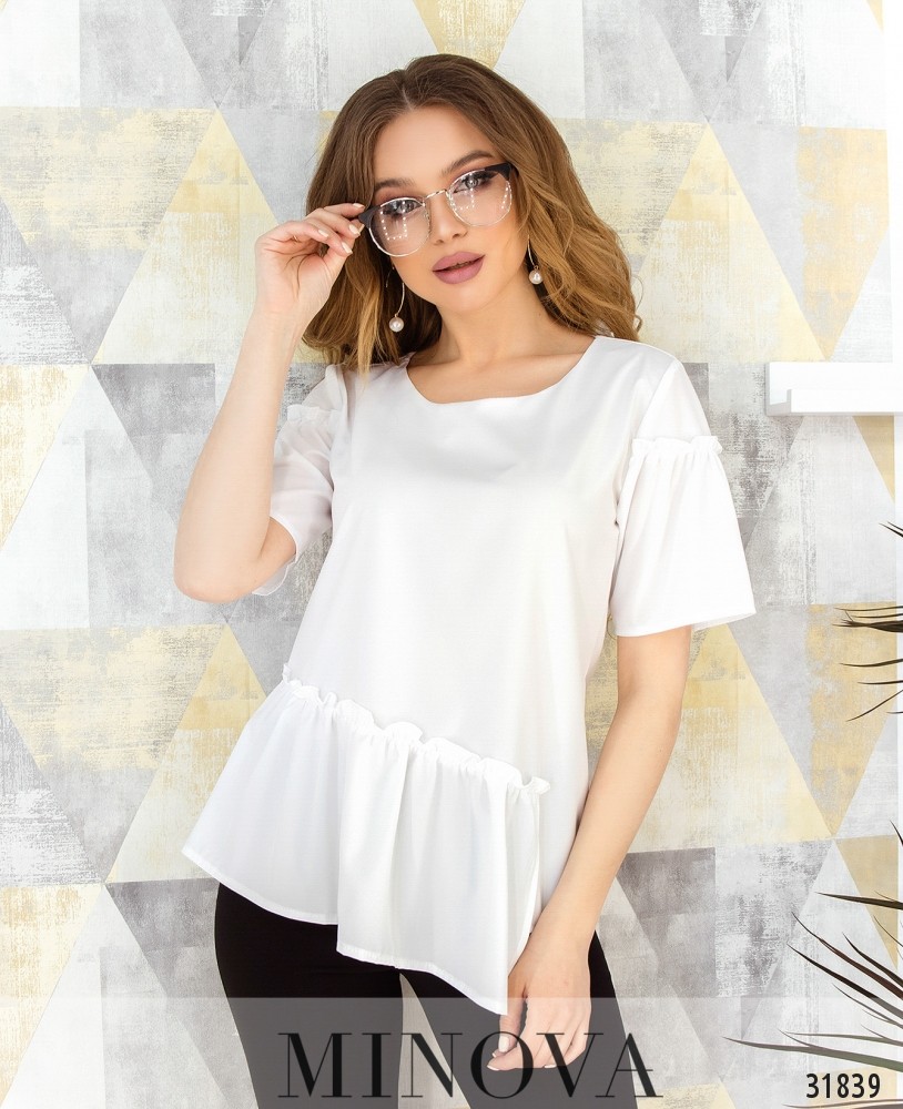 Романтична блуза з рукавами-воланами та асиметричним драпуванням. Блуза вільного крою прикрашена дрібною оборкою на рукавах та драпуванні.
