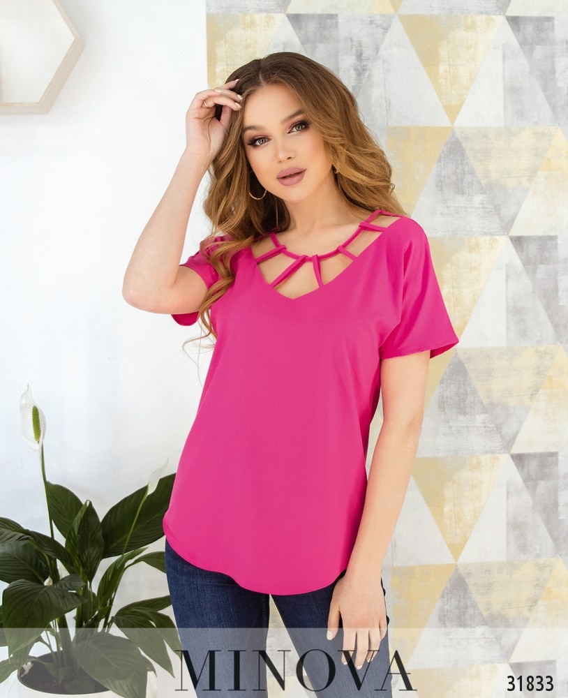 Яскравий топ з оригінальною горловиною. Топ прямого крою з короткими рукавами та закругленим подолом. Декольте V-форми прикрашено декоративними петельками.