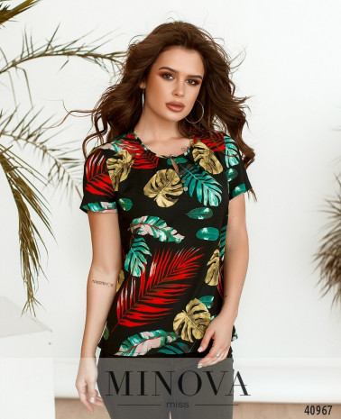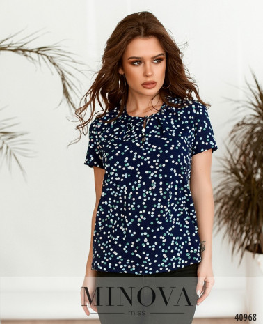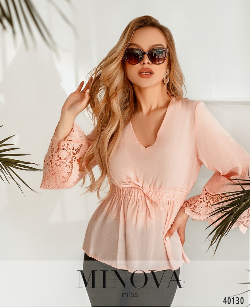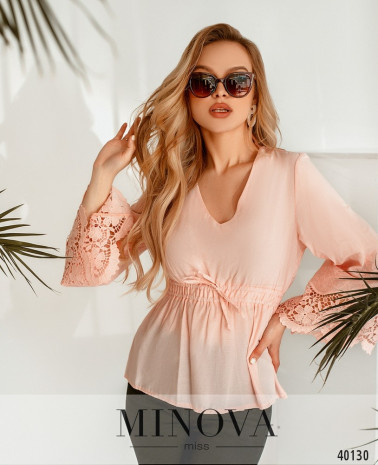 Нежная блузка с цветочным принтом, подол присобран на резинку, украшен кружевом. Рукава-фонарики, в них вшита резинка. Вырез горловины неглубокий, с завязками. Застёжек и карманов нет.
