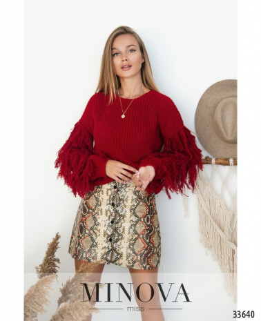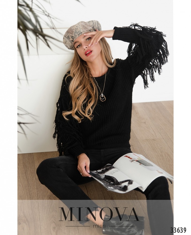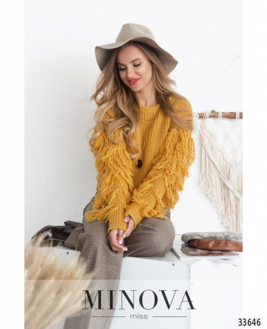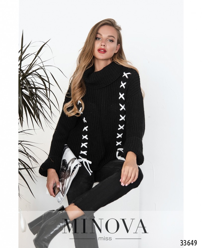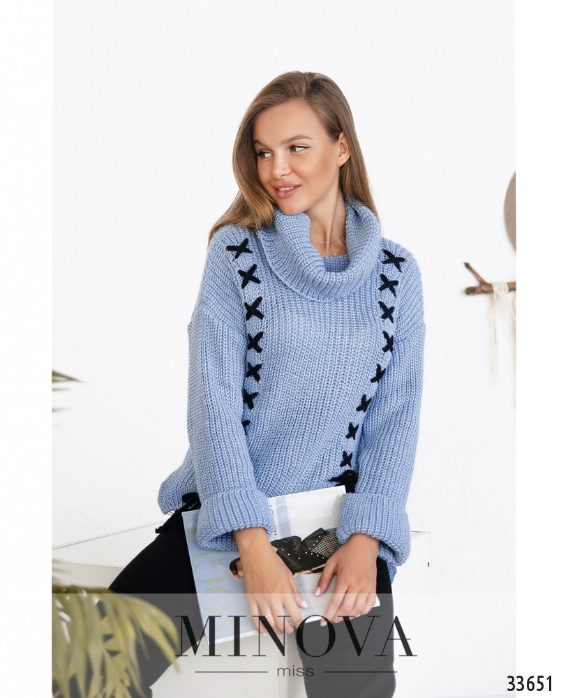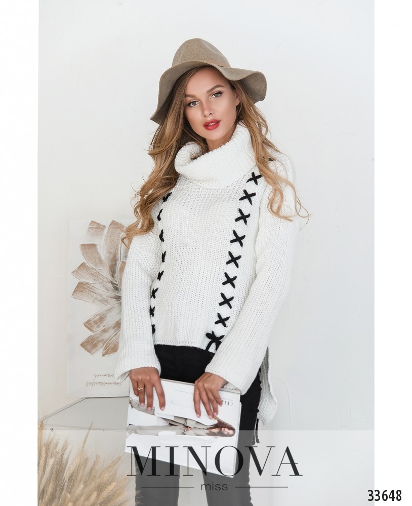 В\'язаний светр з контрастною шнуровкою та розкльошеними рукавами-дзвонами. Рукава підгортаються в широкі манжети. Широкий комірець-гольф та подовжений на спині поділ з розрізами.