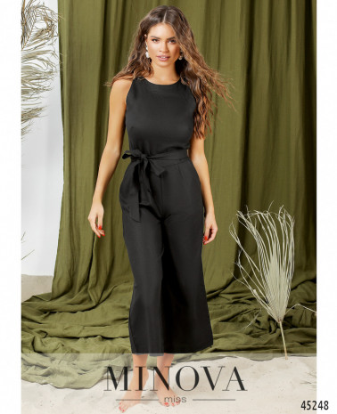 Минималистичный и очень привлекательный комбинезон с закрытым передом и спинкой, без рукавов, по бокам - врезные карманы, застёгивается на вшитую по спинке молнию. Брюки расклешённые. На груди - скульптурирующие вытачки. Пояс входит в комплект.
