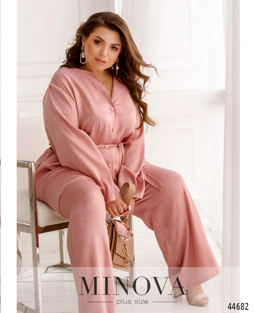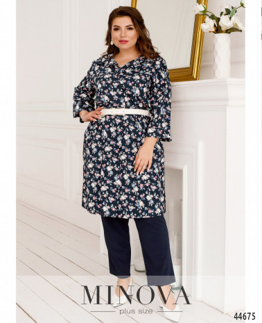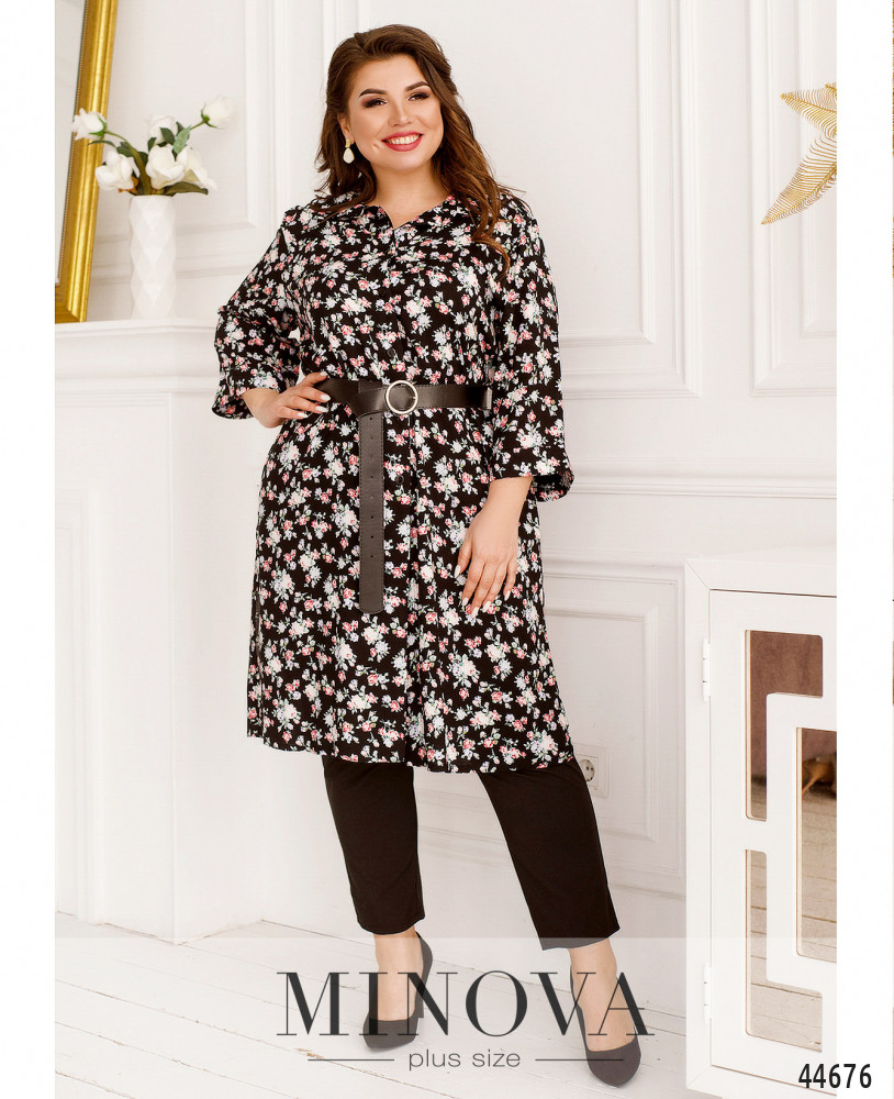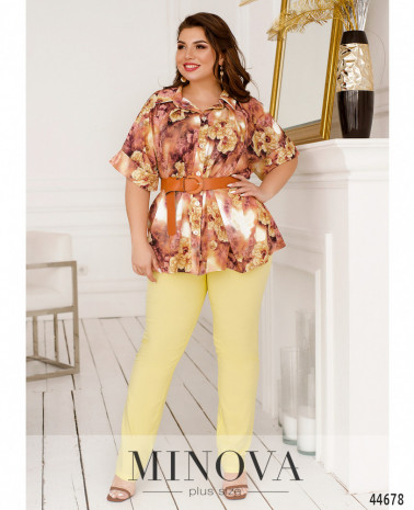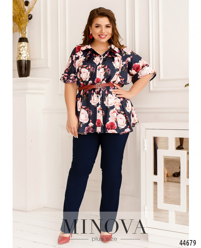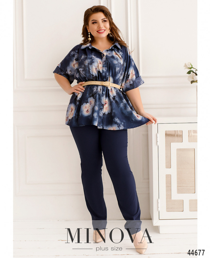 Стильный костюм батал, рубашка с отложным воротничком, рукава короткие, с манжетами. Застёжка - ряд пуговиц спереди на планке. Карманов нет. Брюки со вшитой в пояс резинкой, по бокам - карманы в шве, посадка высокая, застёжек нет.