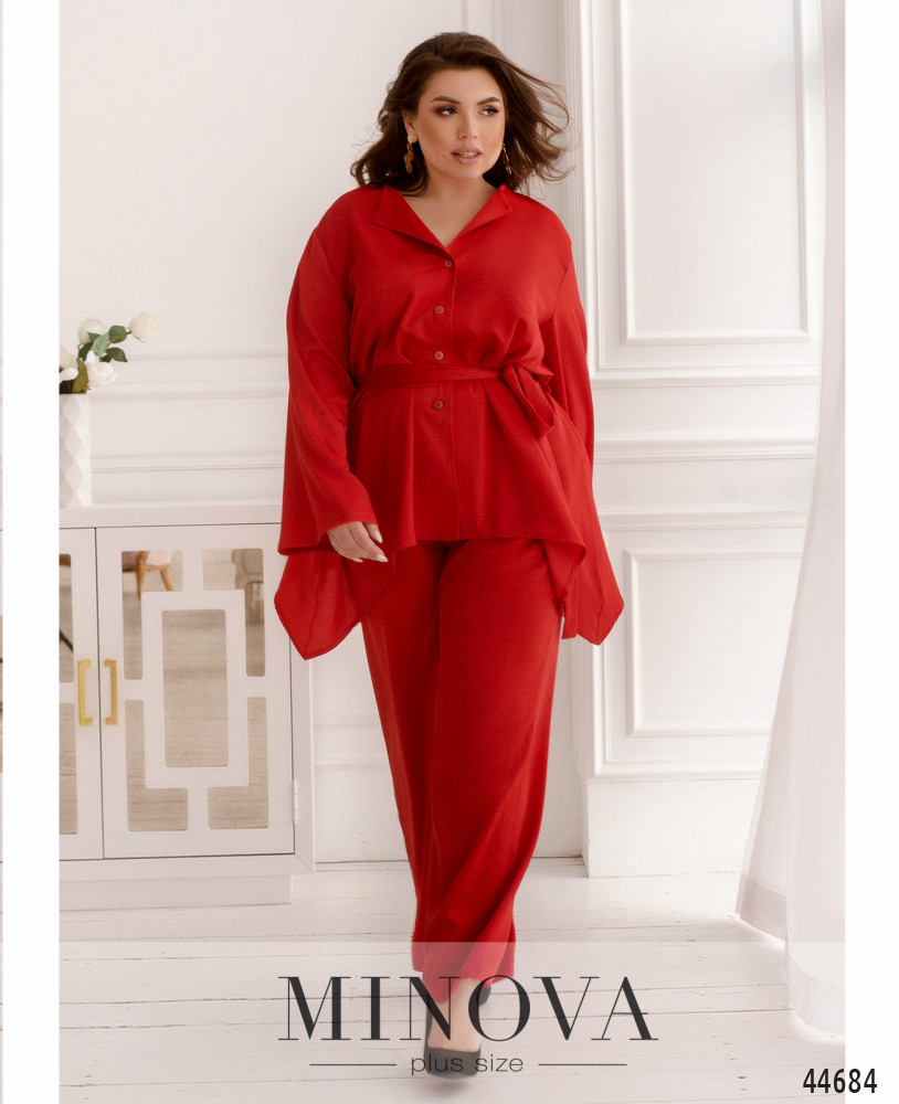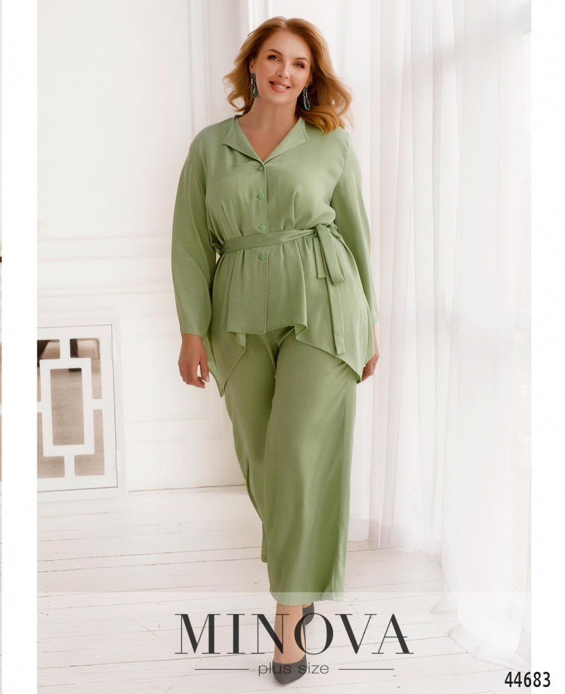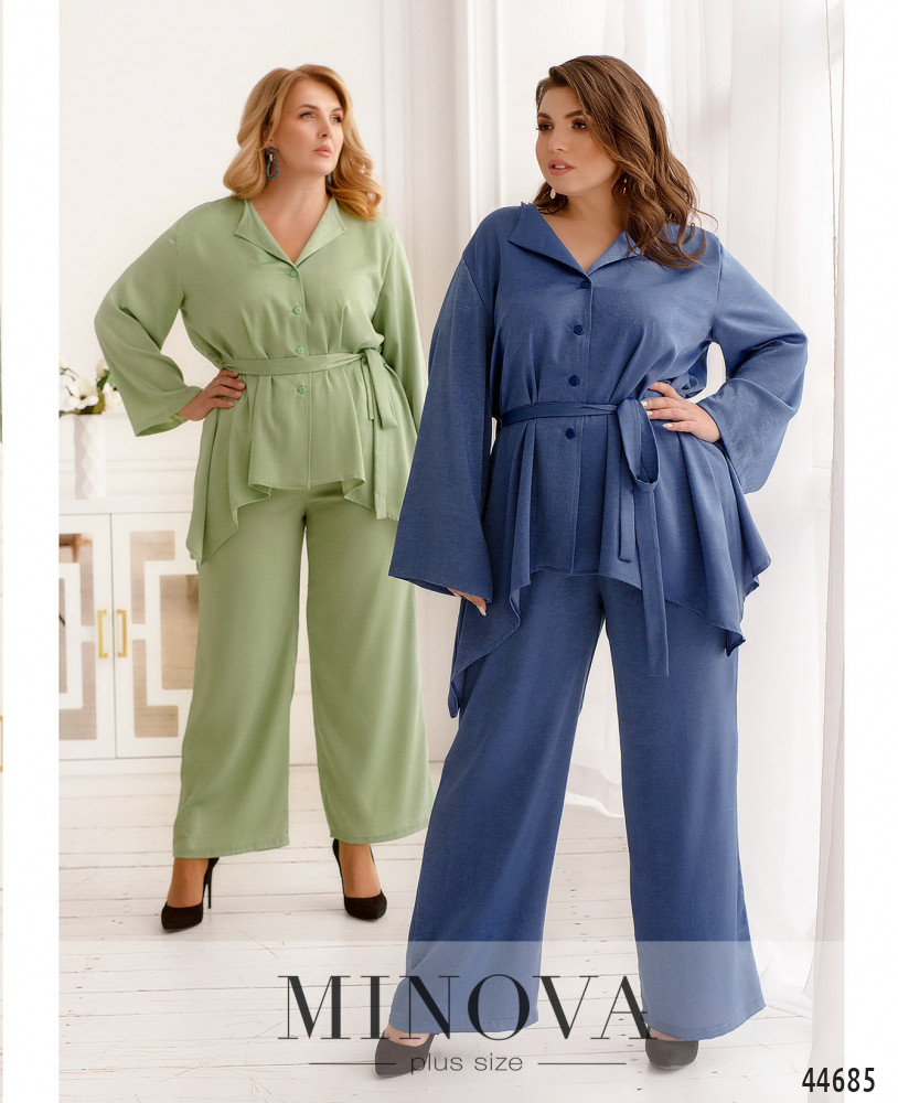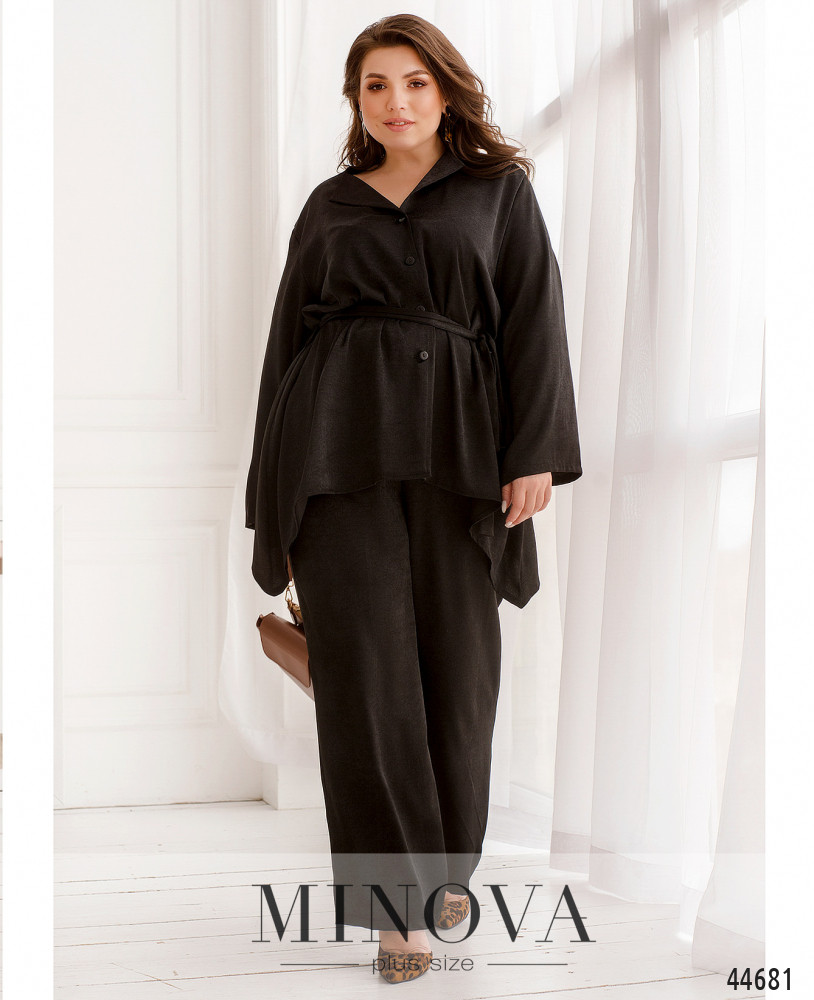 Стильный костюм батал, рубашка с отложным воротничком, рукава короткие, с манжетами. Застёжка - ряд пуговиц спереди на планке. Карманов нет. Брюки со вшитой в пояс резинкой, по бокам - карманы в шве, посадка высокая, застёжек нет.