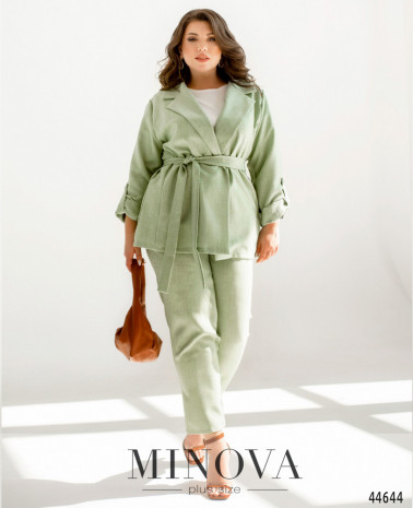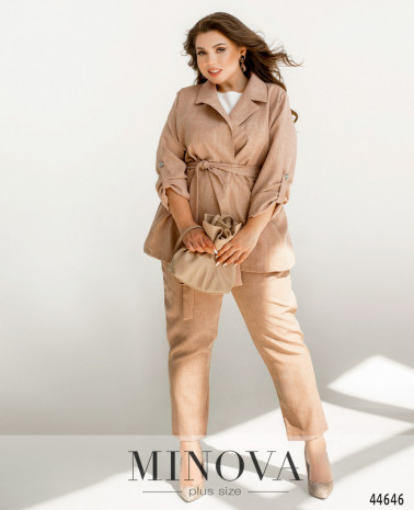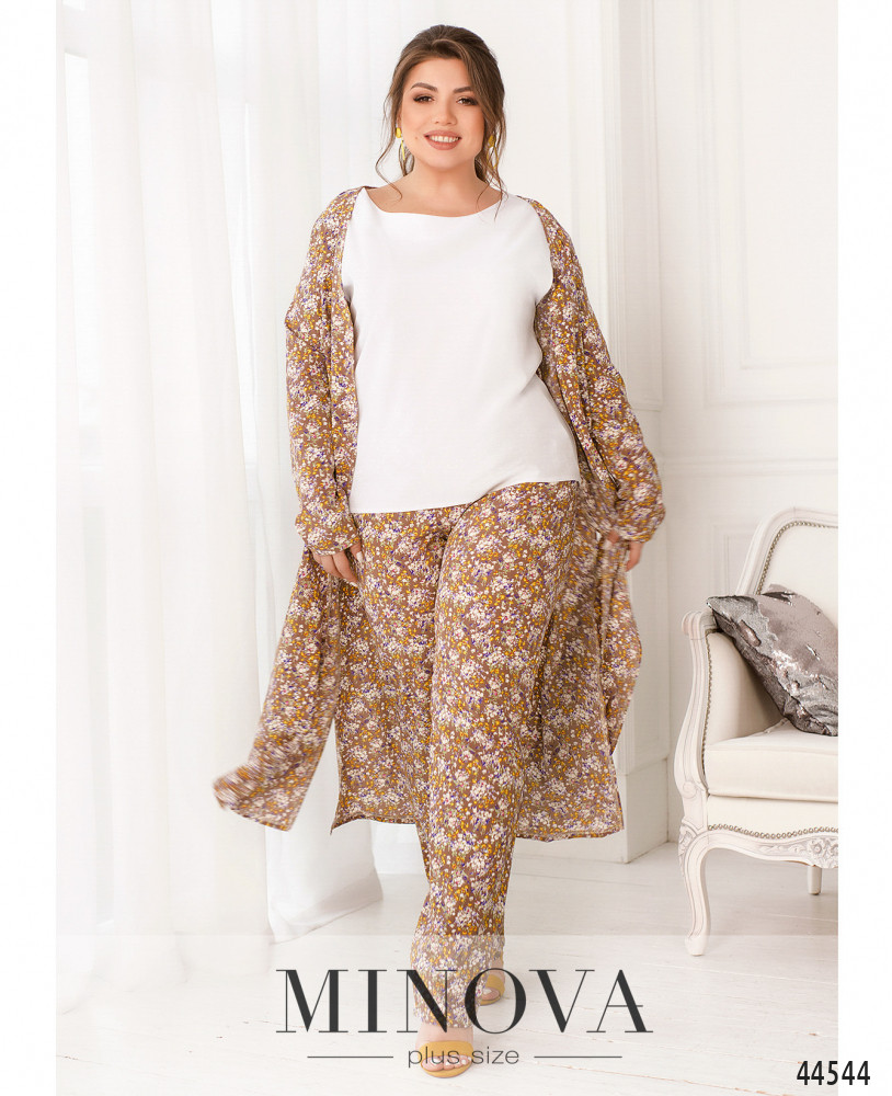 Елегантний та стильний костюм трійка великого розміру. Верхня сорочка подовжена, з відкладним комірцем, на грудях накладна кишеня, з боків - довгі розрізи. На рукавах манжети, на манжетах по одному гудзику. Брюки з високою талією, з боків - кишені в шві, до поясу вшито резинку. Майка з півкруглим вирізом горловини, на грудях виточки, з боків подолу - розрізи. Без кишень і застібок.
