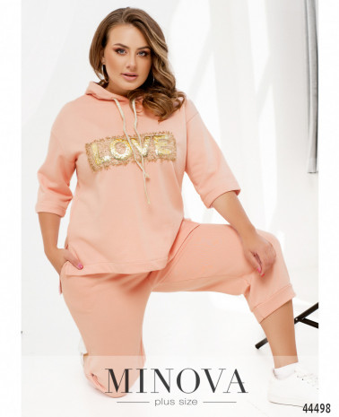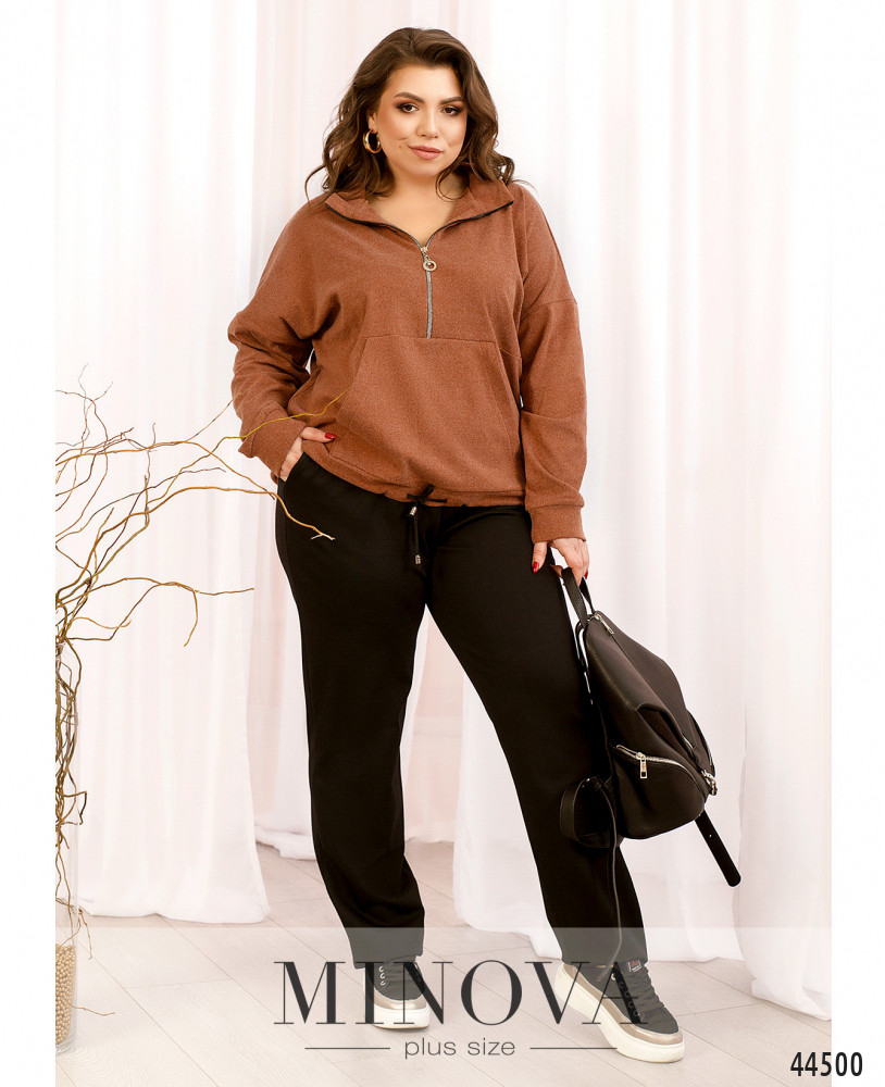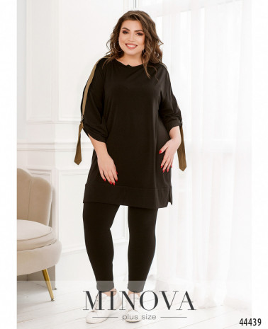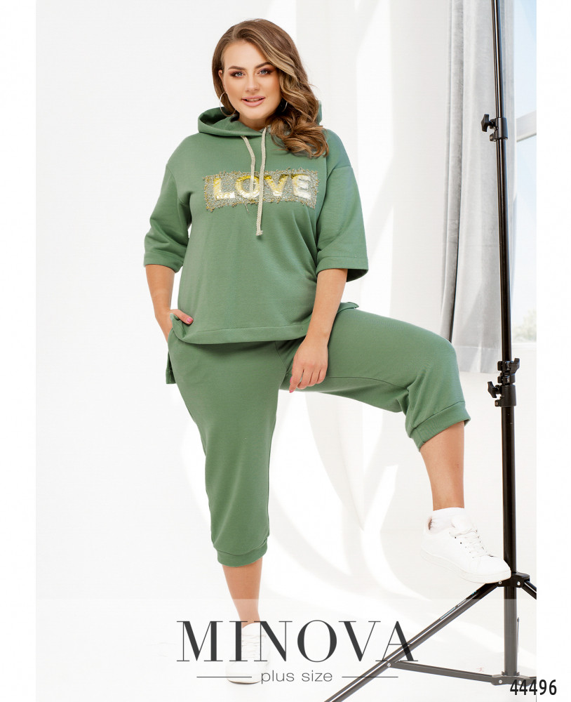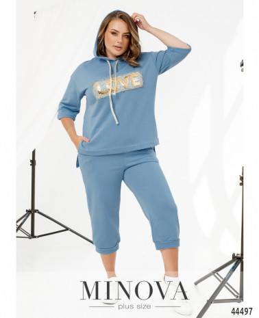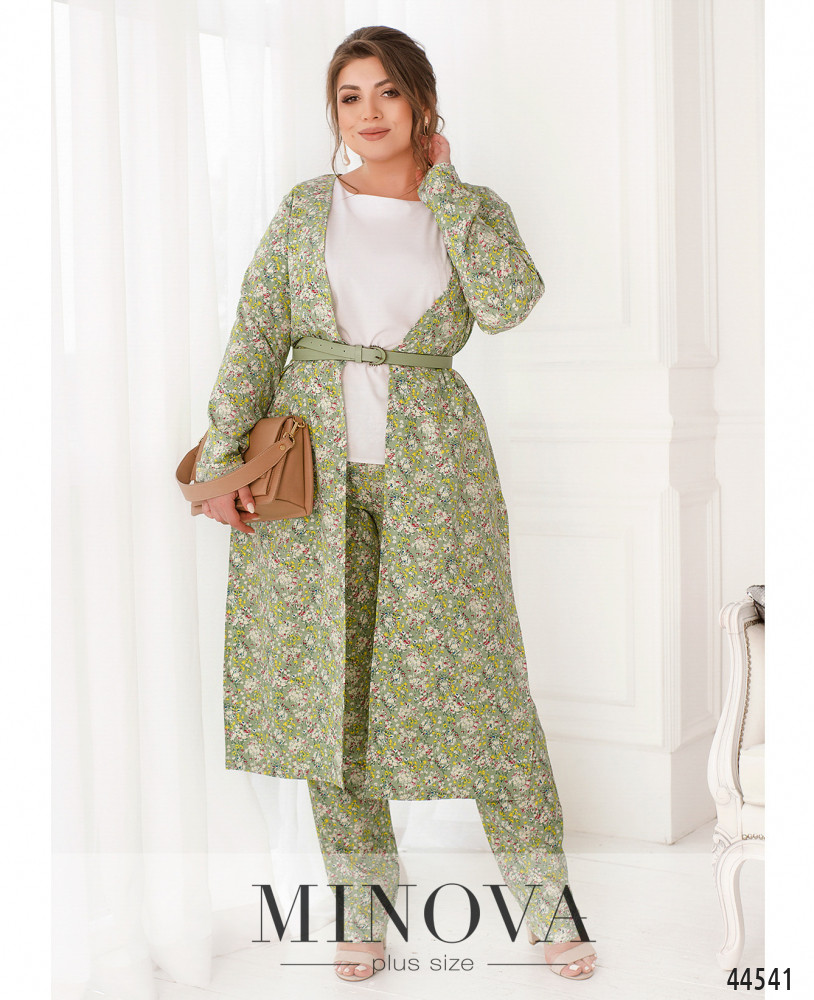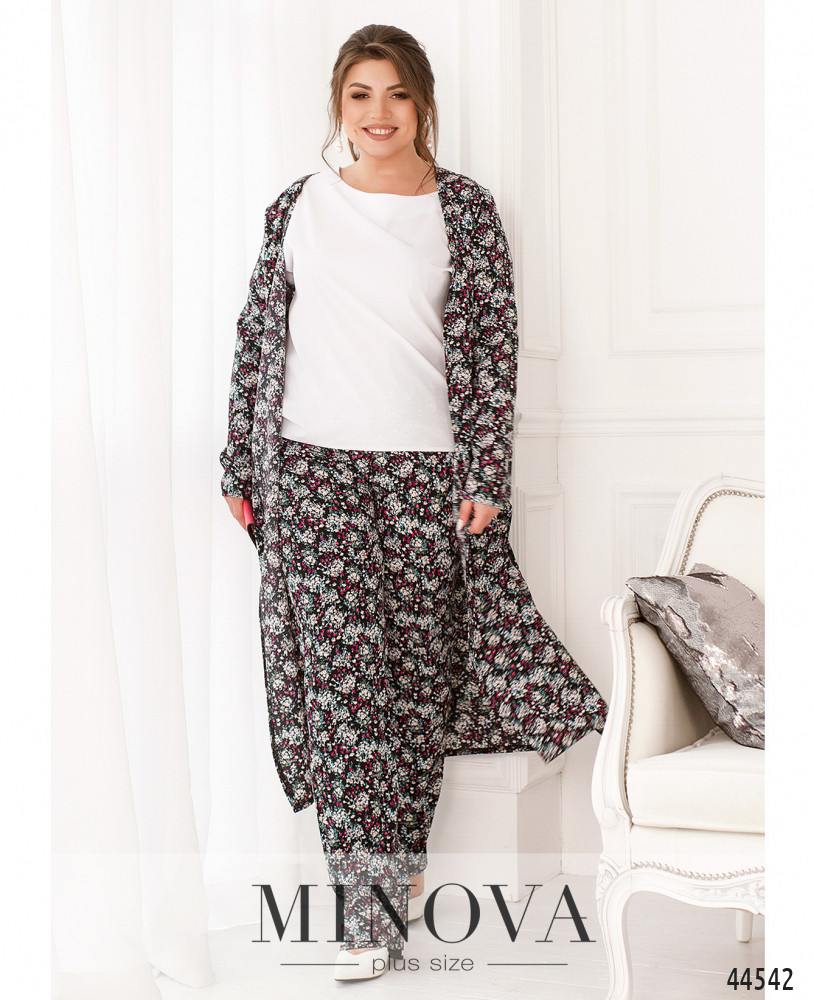 Яскравий та оригінальний костюм-трійка батал. Кардиган без застібок та кишень, рукава без манжетів, на подолі з боків дуже довгі розрізи. Футболка з коротким рукавом, вирізом горловини "човник", без застібок та кишень. Брюки з високою посадкою, до поясу вшито резинку, з боків - кишені в шві, застібок немає.