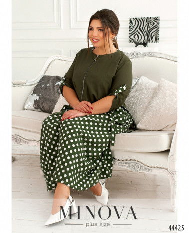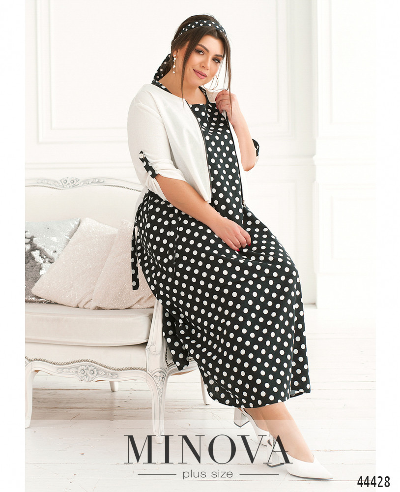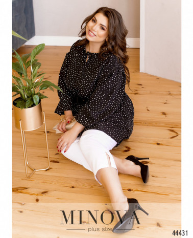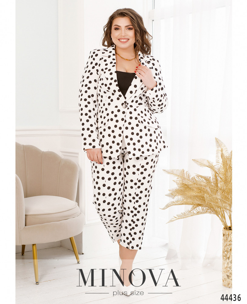 Яскравий та оригінальний костюм-двійка батал. Піджак з різьбленими лацканами, без підкладки, рукава без гудзиків. Спереду - декоративні клапани, кишень немає. Однобортний, застібається на один гудзик. Поділ відрізний, на талії спереду повздовжні виточки вгору, до грудей. Є підплечники. Брюки зі вшитою ззаду резинкою, посадка висока, з боків - кишені в шві, на стегнах ззаду декоративні клапани.