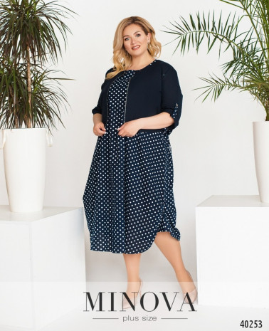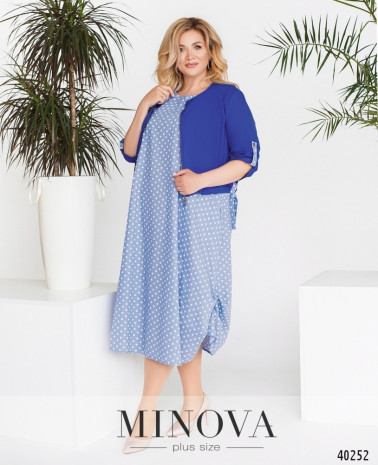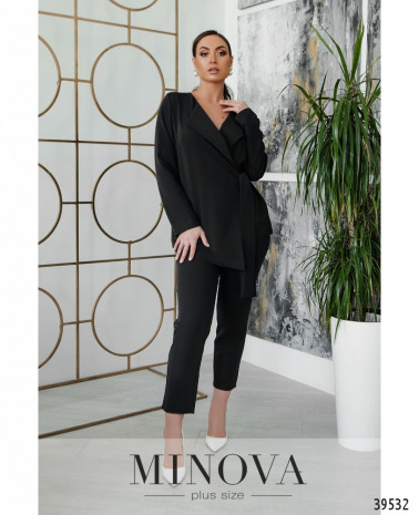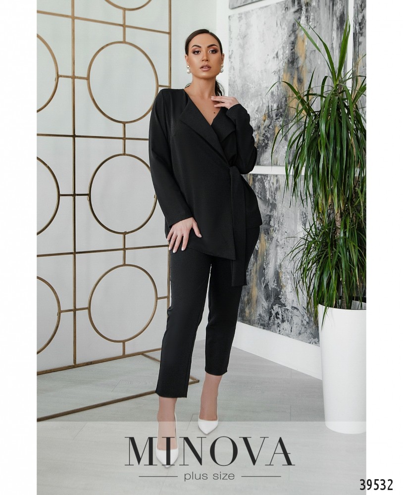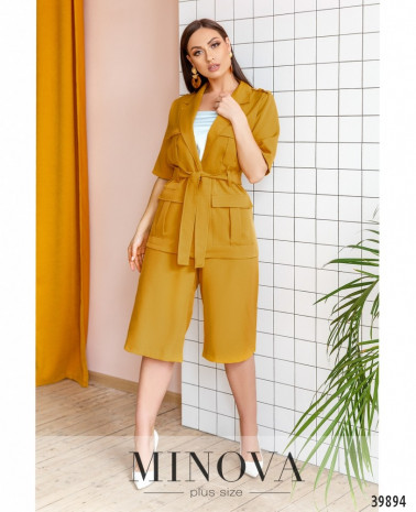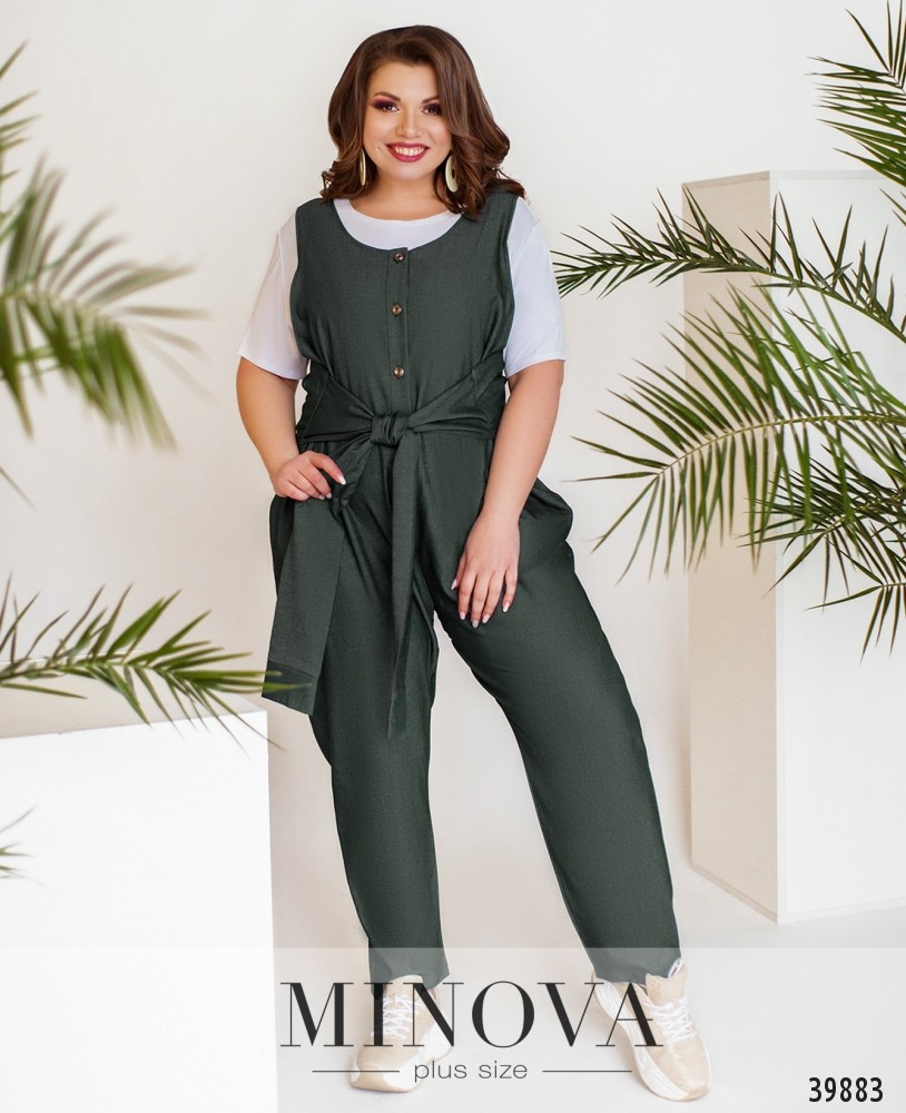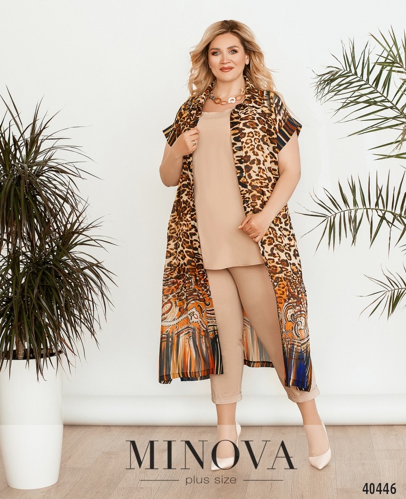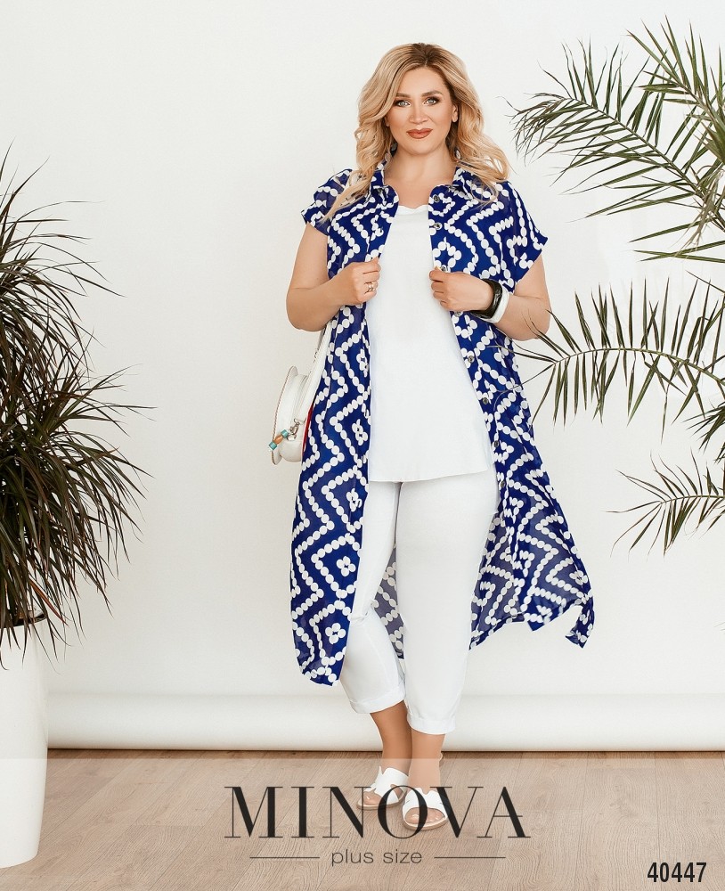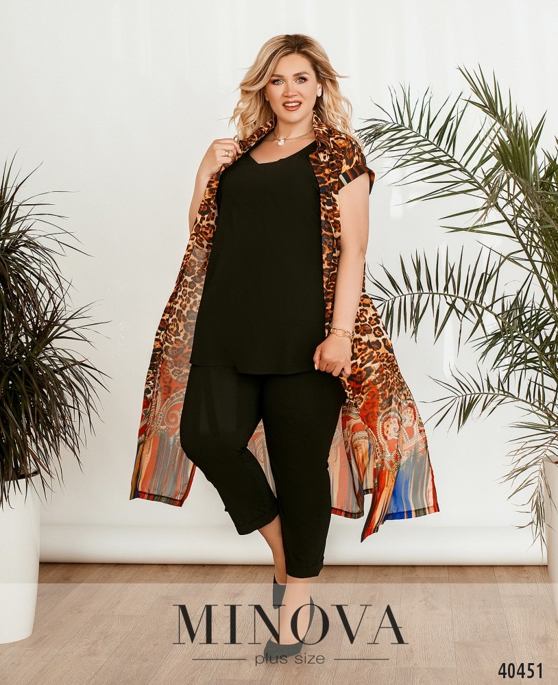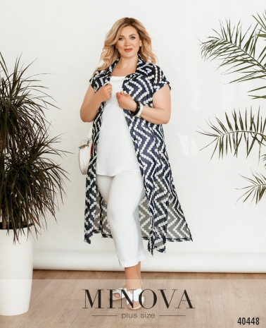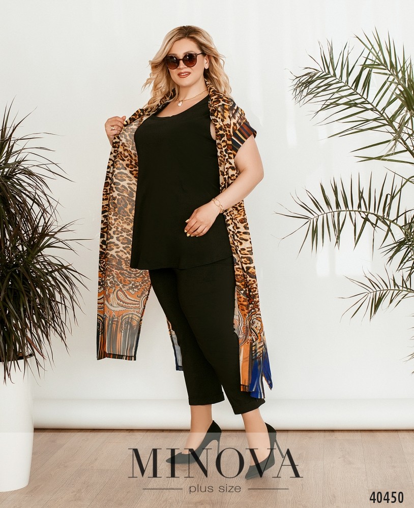Стильний, легкий та комфортний костюм-трійка великого розміру, в комплекті легка напівпрозора накидка з рядом гудзиків спереду на планці, рукава короткі, з відворотами, кишень немає, з боків подолу - розрізи. Футболка без кишень та застібок. Брюки з високою талією, до поясу вшито резинку, без манжетів.