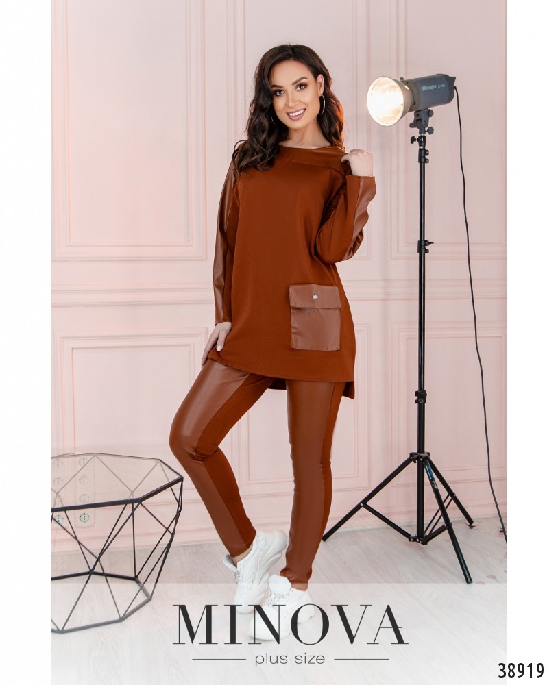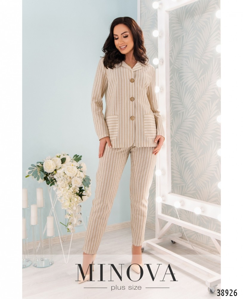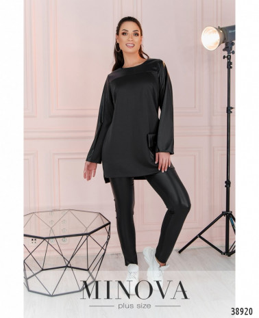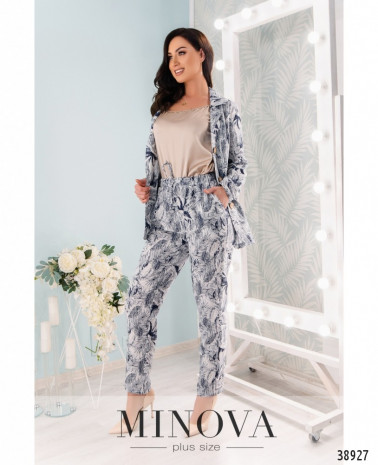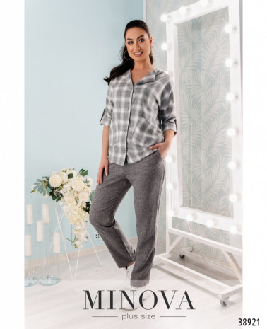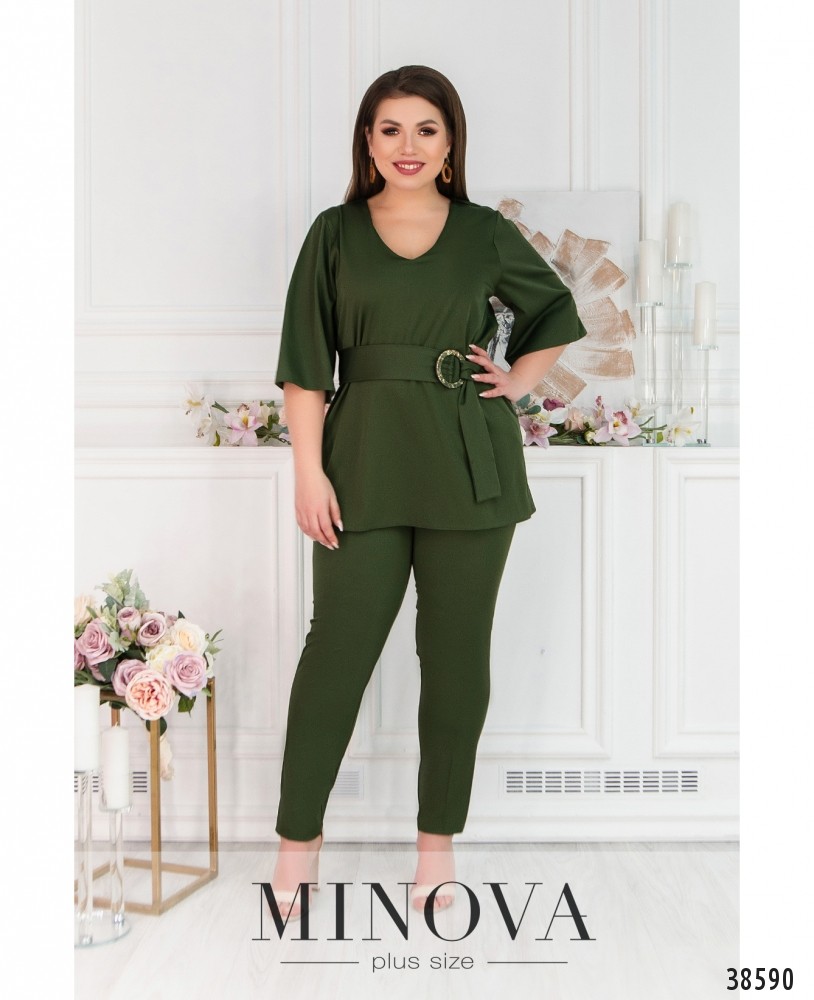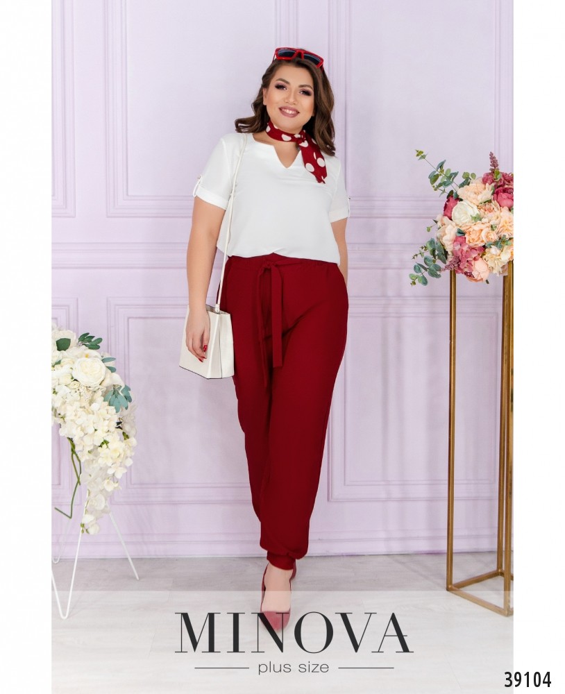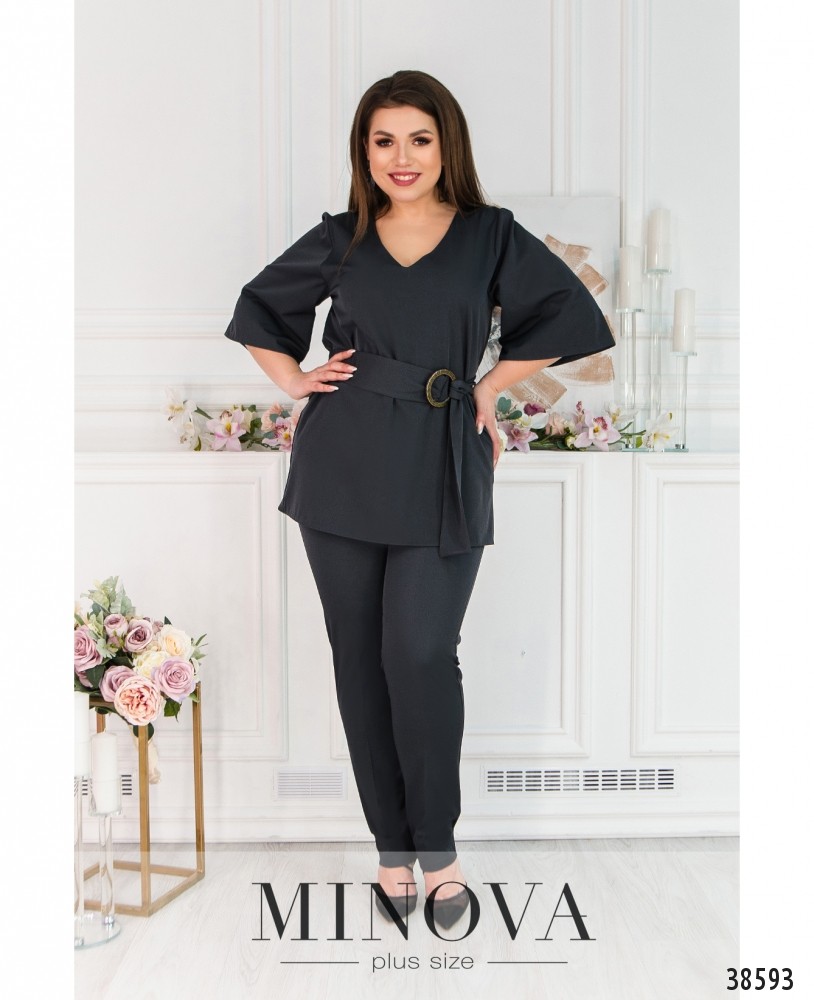 Ніжний костюм-двійка плюс сайз з блузою та брюками. Брюки високої посадки, до поясу ззаду вшито резинку, з боків – кишені в швах, по центру напрасовані «стрілки». Блуза з розкльошеними рукавами без манжетів, виріз горловини V-форми, застібок та кишень немає. В комплекті пояс з круглою пряжкою.