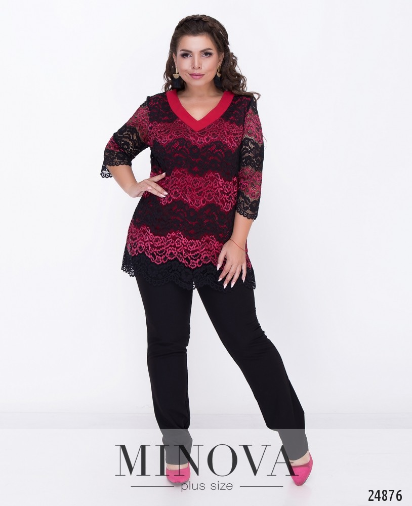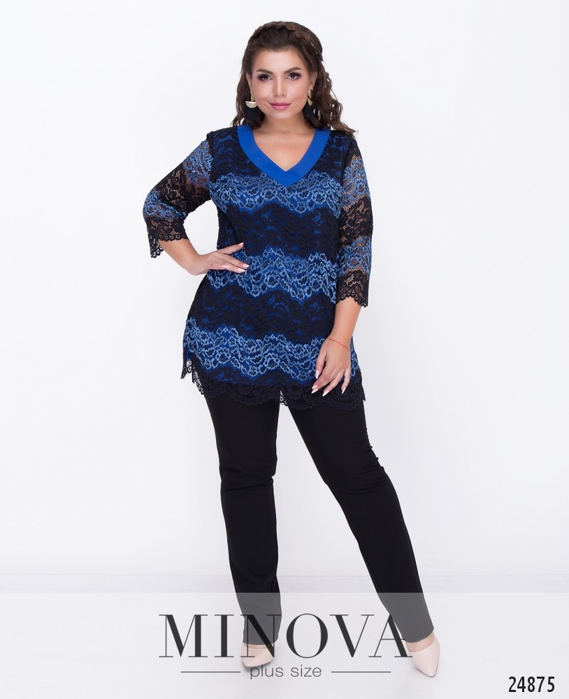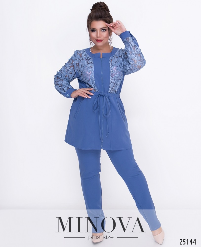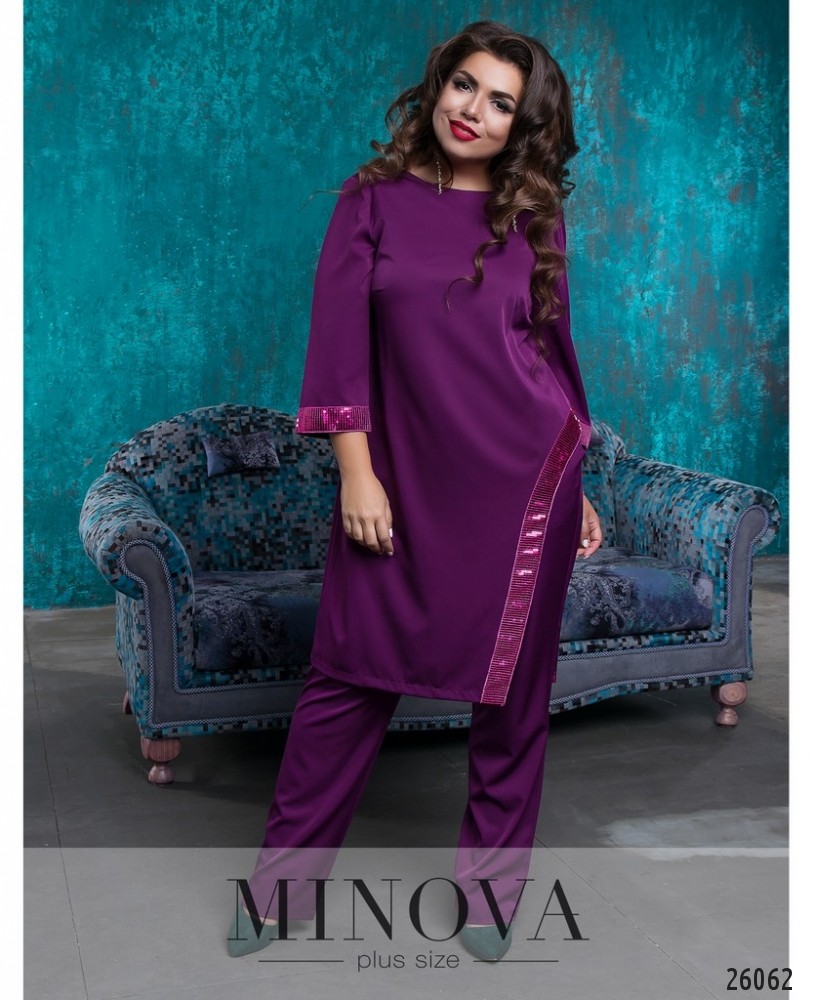 Костюм-двійка зі вставками з еко шкіри. Костюм представлений вільною кофтою з короткими рукавами та прямими брюками з лампасами. Розкльошена туніка з розрізами з боків. Рукава та декоративна планка виготовлені з еко шкіри. Планка прикрашена люверсами. Брюки з кишенями прикрашені лампасами з еко шкіри. Пояс представлений резинкою.