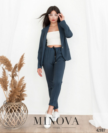 Элегантный костюм-двойка с брюками и пиджаком. Пиджак без подкладки, лацканы гладкие. Рукава без пуговиц. Однобортный, застёгивается на одну пуговицу. Брюки с высокой посадкой, в пояс вшита резинка и пропущен шнурок, по бокам - врезные карманы, снизу небольшие манжеты.
