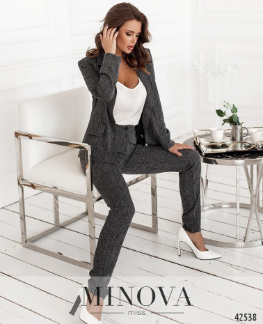 Деловой костюм с пиджаком и брюками. Пиджак без подкладки, приталенный, с подплечниками, застёгивается на одну пуговицу. Карманов нет, есть декоративные клапаны. Брюки с высокой талией, застёгиваются на молнию под ширинкой и пуговицу. По бокам - врезные карманы, на талии шлейки для ремня.