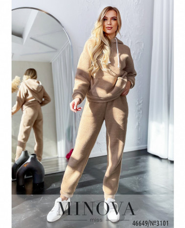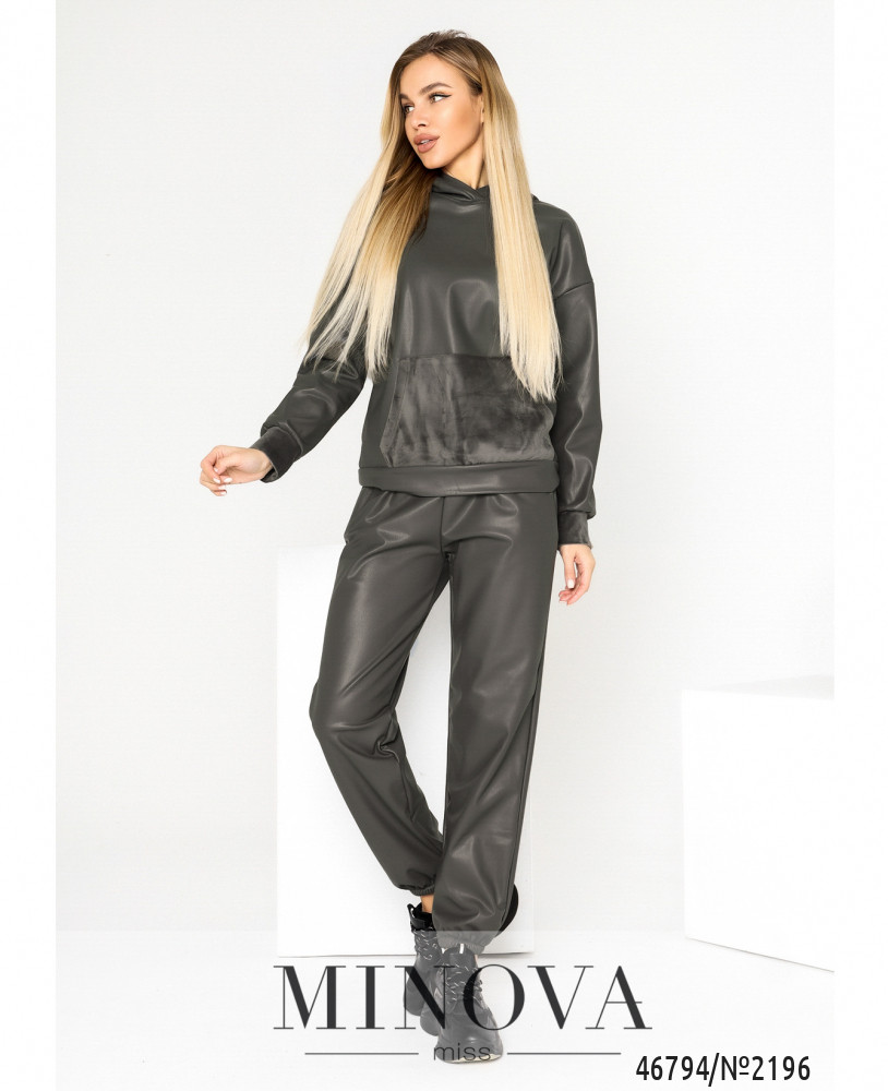 Стильний спортивний костюм, виконаний з еко-шкіри, може стати улюбленою річчю для жінки, яка цінує практичність і не забуває про модні тенденції. Мінімалістичні штани-джогери з кишенями в бічних швах і резинками, вшитими по лінії талії і по низу штанин, доповнює худі в тон з капюшоном, кишеня-кенгуру і манжети якого виконані з м'якого велюру.
