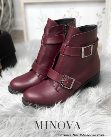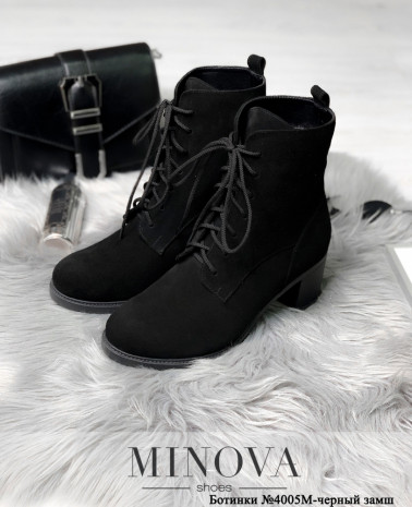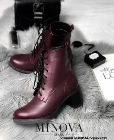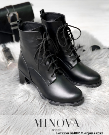 Строгие, минималистичные, но очень стильные ботинки из прекрасной натуральной кожи – гладкой, замшевой или лакированной, представлены в каталоге Minova в нескольких цветовых решениях. Так вы сможете выбрать модель, идеальную для вашего гардероба. Обувь однотонная, без инородных вставок. На подъёме располагается рабочая шнуровка с тонкими шнурками, без металлических колечек (люверсов) на отверстиях. Под шнуровкой – плотный язычок для большей герметичности. Внутри ботинки утеплены цигейкой. Каблук средней высоты, квадратный, удобный для долгих пеших прогулок, протектор мелкоребристый. Сзади сверху подшита петелька. Такие ботинки удачно будут сочетаться и с юбкой, и с брюками.