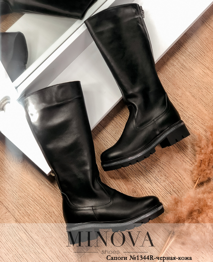 Зручні високі чоботи з асиметричним верхом. На внутрішньому боці – блискавка від верха до підошви, та невелика виточка для розширення халяви. Каблук невисокий, стійкий, підошва з крупноребристим рисунком протектора.