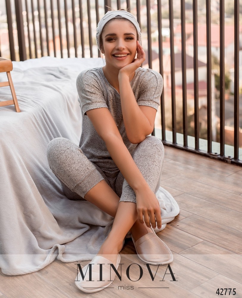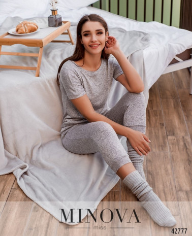 Удобный минималистичный костюм-двойка, футболка без застёжек и карманов, с полукруглым вырезом горловины. Брюки с манжетами, без застёжек, с врезными карманами и вшитой в пояс резинкой, посадка высокая.