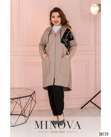 Мягкий и привлекательный повседневный длинный кардиган батал с капюшоном, через капюшон пропущен шнурок. На левой стороне груди - декоративная нашивка, украшенная узором из страз. По бокам - вместительные накладные карманы. Без подкладки.