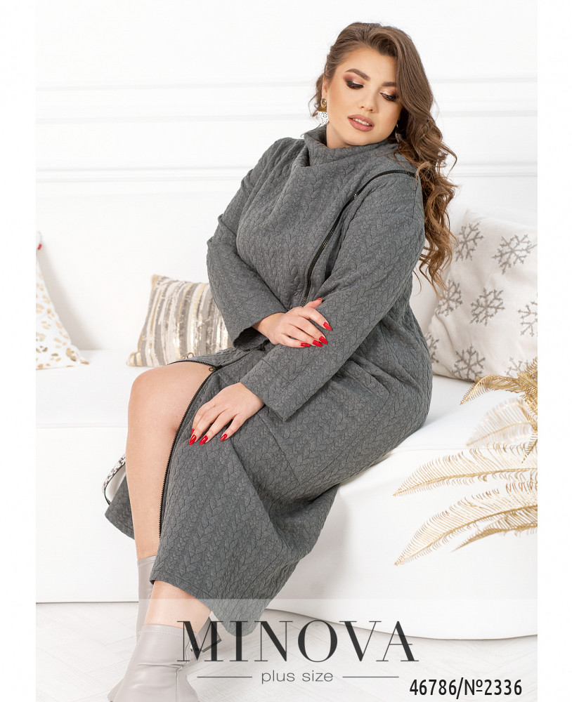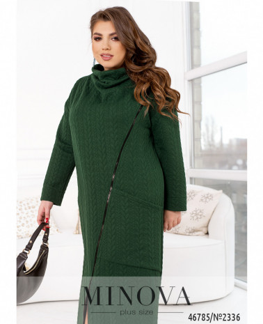 Тепла сукня-міді, що виконана з м'якої структурної тканини, відрізняється універсальністю, а також вдало вписується в будь-який стиль. Модель з високим цільнокроєним коміром доповнена довгими рукавами з приспущеною лінією плечей і великою накладною кишенею спереду. Сукня застібається на змійку, вшиту спереду по діагоналі.