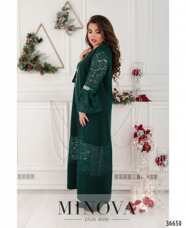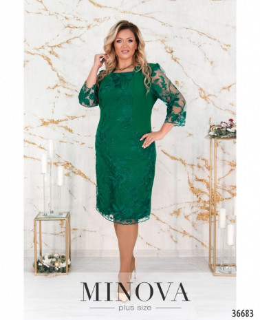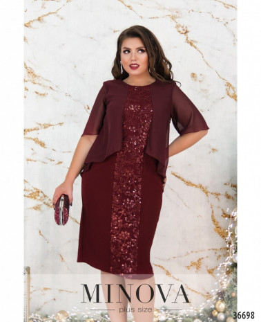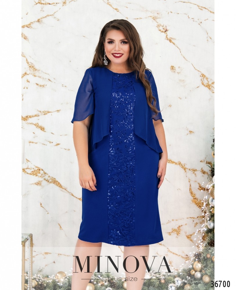Нужно выглядеть нарядно и в то же время сдержанно? Minova предлагает отличный вариант платья батал. Платье прямого кроя, но эта особенность сглаживается подшитой сверху накидкой, ниспадающей мягкими асимметричными складками. Ткань мягкая, приятная к телу. Спереди по центру – широкая полоса с вышивкой и пайетками, от полукруглого выреза горловины до подола. Карманы и застёжки отсутствуют. Накидка из полупрозрачной ткани, сзади полностью закрывает спинку до бедра. Рукава до локтя, без подкладки и манжет, полупрозрачные, свободные. Платье длины миди, будет хорошо смотреться на любой фигуре с обувью на танкетке или каблуке.