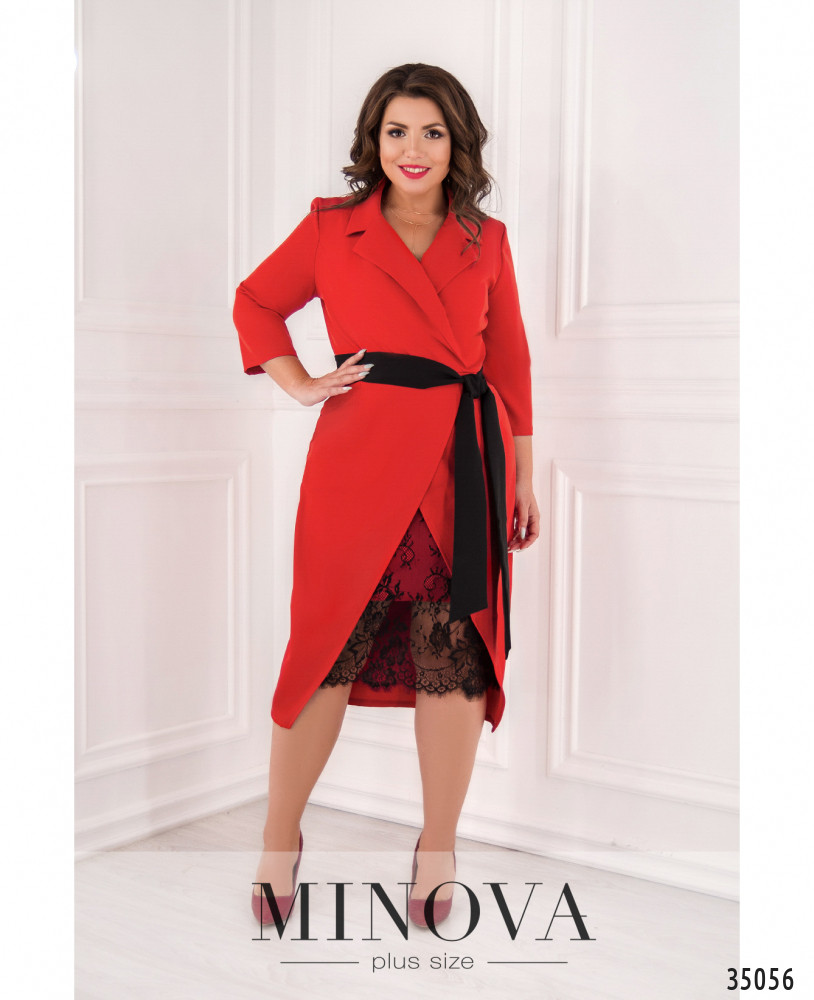 Очень нежное и нарядное приталенное платье батал от Minova позволит вам создать нарядное настроение даже на работе! Платье из лёгкой ткани, на запАх, с лацканами. Подол с глубоким вырезом, прикрытым ажурным изящным кружевом. Рукава ¾, без манжет. В наличии – пояс. Змейка расположена слева подмышкой, до бедра. Карманы отсутствуют. Длина миди. Можете выбрать яркий, пастельный или тёмный оттенок. Платье будет удачно смотреться на любой фигуре, а сочетать его лучше с туфельками на высоком каблуке или на танкетке. Пояс/аксессуар входит в комплект.