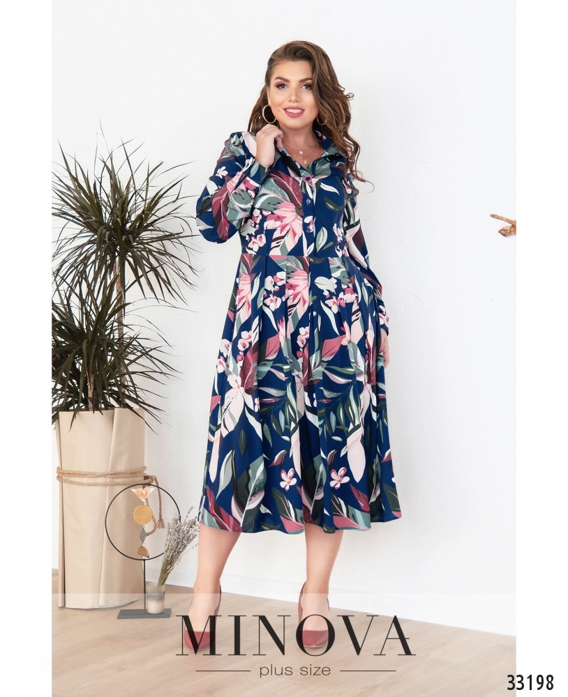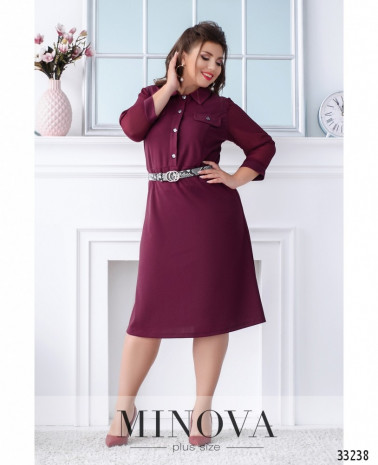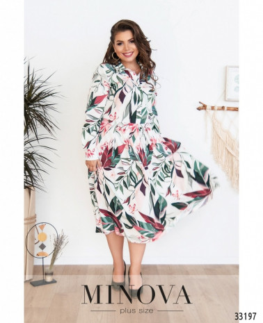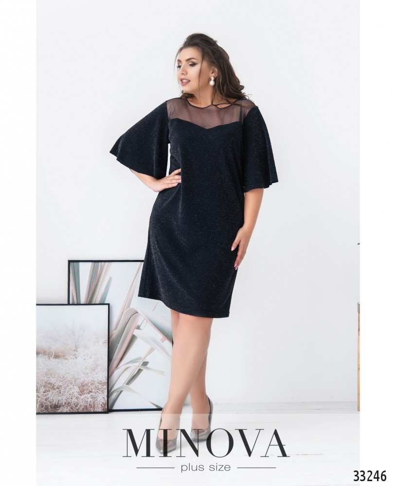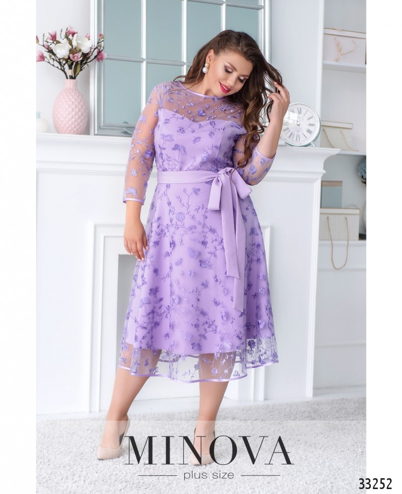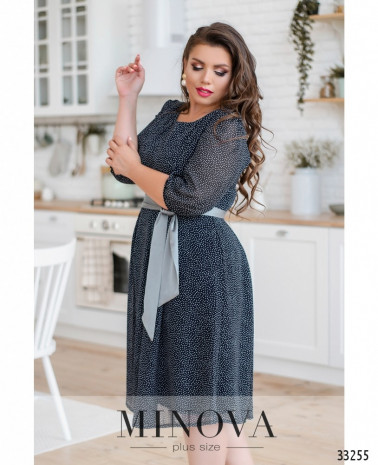 Ніжна сукня батал, що складається з двох шарів: прозорого та легкого верхнього і більш щільного нижнього, який не просвічує. Рукава повністю прозорі. Виріз горловини - широкий, півкруглий, кишень немає. Застібається на вшиту по спинці блискавку. На поясі вшито резинку, тому поділ спадає м'якими складками.