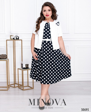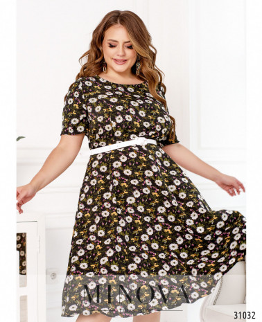 Жіночна сукня міді в романтичному стилі з непомітною блискавкою на спинці сподобається тим, хто цінує лаконічні класичні форми. Мінімалістичний крій верхньої частини приталеної сукні з напівкруглим вирізом горловини і короткими рукавами доповнений повітряним подолом напівкльош без кишень. Силует підкреслять скульптуруючі виточки і контрастний пояс, який входить в комплект.