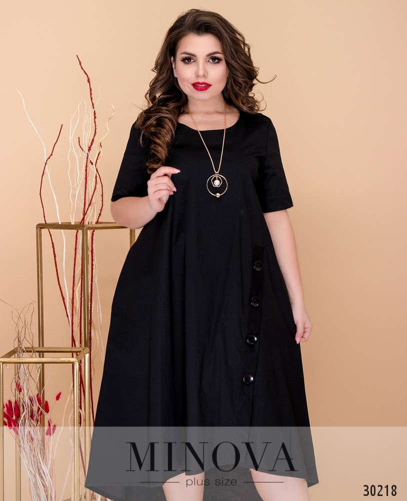 Свободное платье с неровным подолом. Платье с короткими рукавами от груди свободно ниспадает. Объемный подол украшен декоративными пуговицами на лицевой стороне.