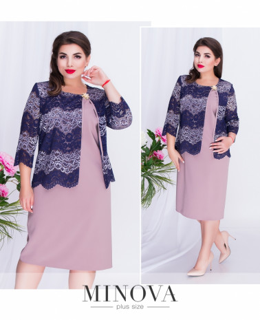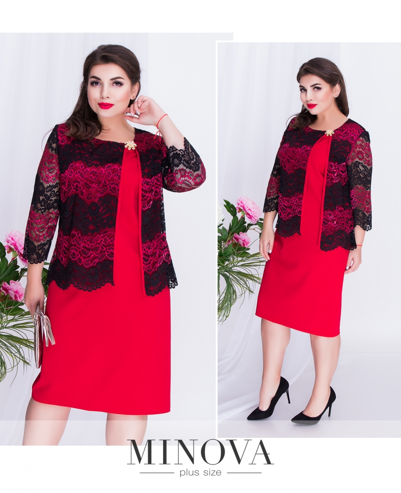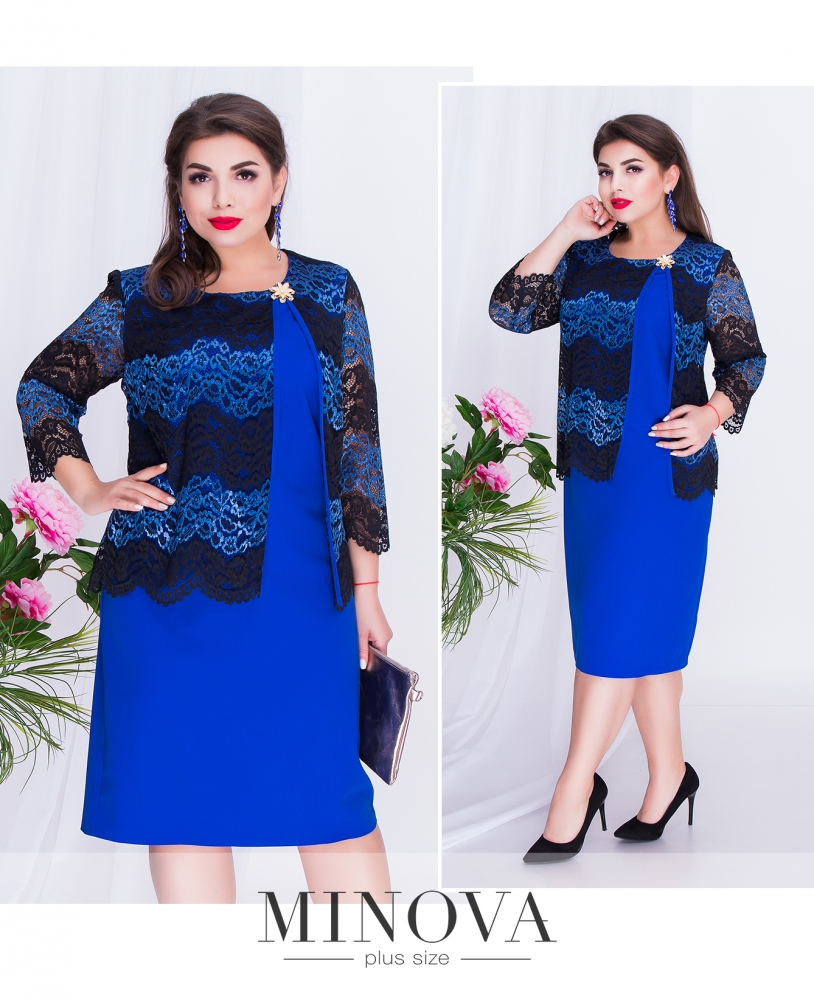 Прямое платье с кружевным жакетом с брошью и рукавом 3/4. Элегантный полупрозрачный фальш-жакет с круглой горловиной, длиной до линии бедра. Длина изделия закрывает колени. Небольшой разрез сзади не сковывает движения.