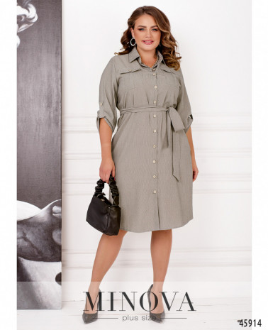 Мінімалістичне м'яке плаття плюс сайз, рукава - з регулювальною стрічкою, пропущеної через отвір, укріплене люверсом, на місці манжет вшиті гумки. З боків-врізні кишені, на грудях виточки, Застібка - блискавка, вшита по спинці.