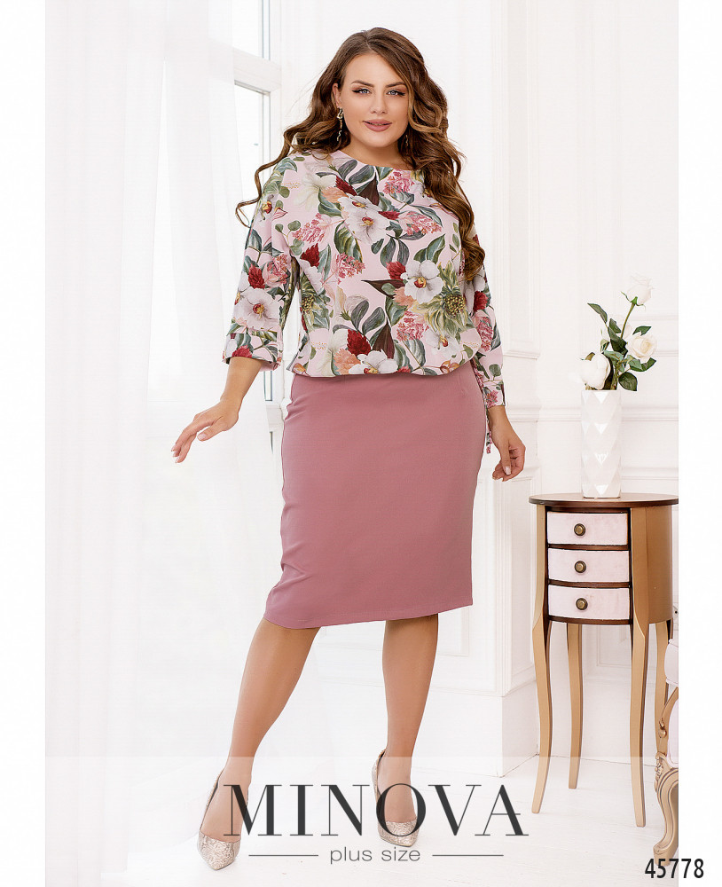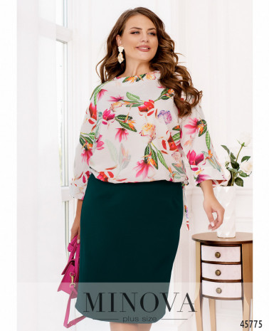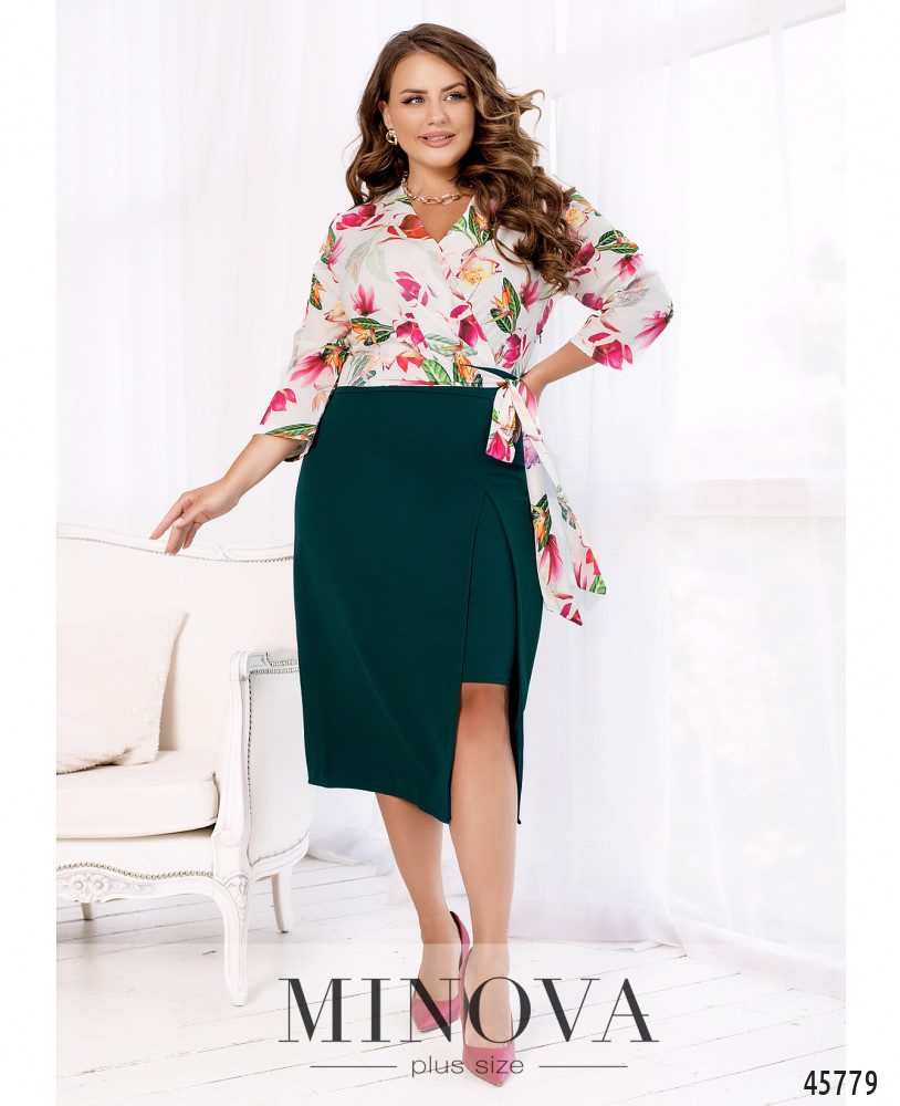 Жіночна приталена сукня виконана з двох видів тканин: однотонної і з контрастним принтом. Яскравий ліф, підшитий на запах, з рукавами 3-4 доповнений незвичайним однотонним подолом, виконаним у вигляді двошарової спідниці з розрізом на верхньому шарі. Текстильний пояс, що робить акцент на талії, пришитий до сукні з боків