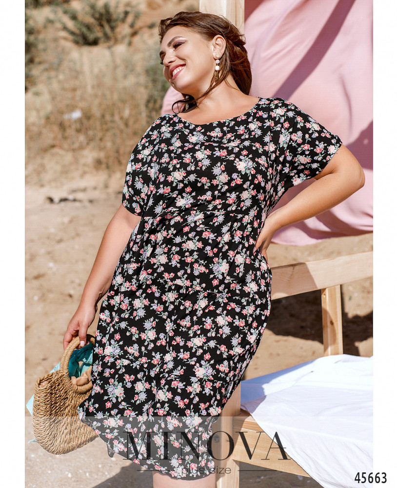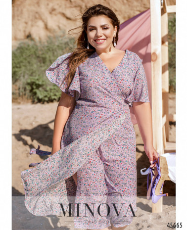 Романтична сукня батал без декора, з рукавами-крильцями. Зав'язується на запин, поясок протягується в проріз збоку на поясі. Кишень та застібок немає, підкладки немає. На грудях виточки.