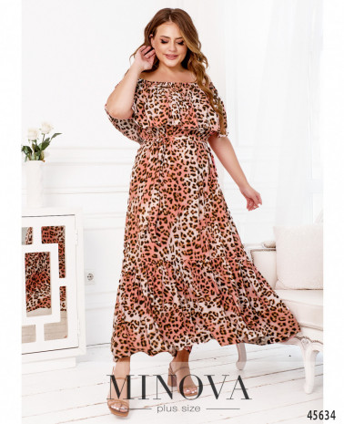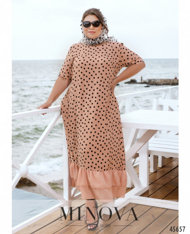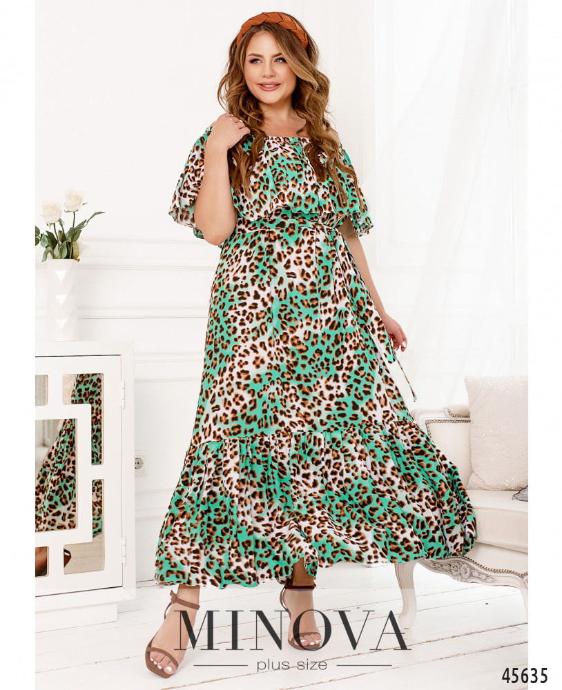 Елегантна та яскрава сукня батал з півкруглим вирізом горловини, з боків - кишені в шві, застібок немає. Рукава без манжетів. На подолі внизу оборки, на грудях - діагональні виточки. Пояс НЕ входить в комплект.