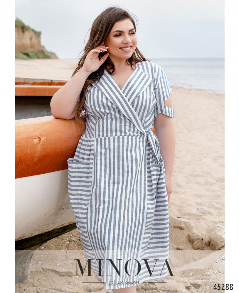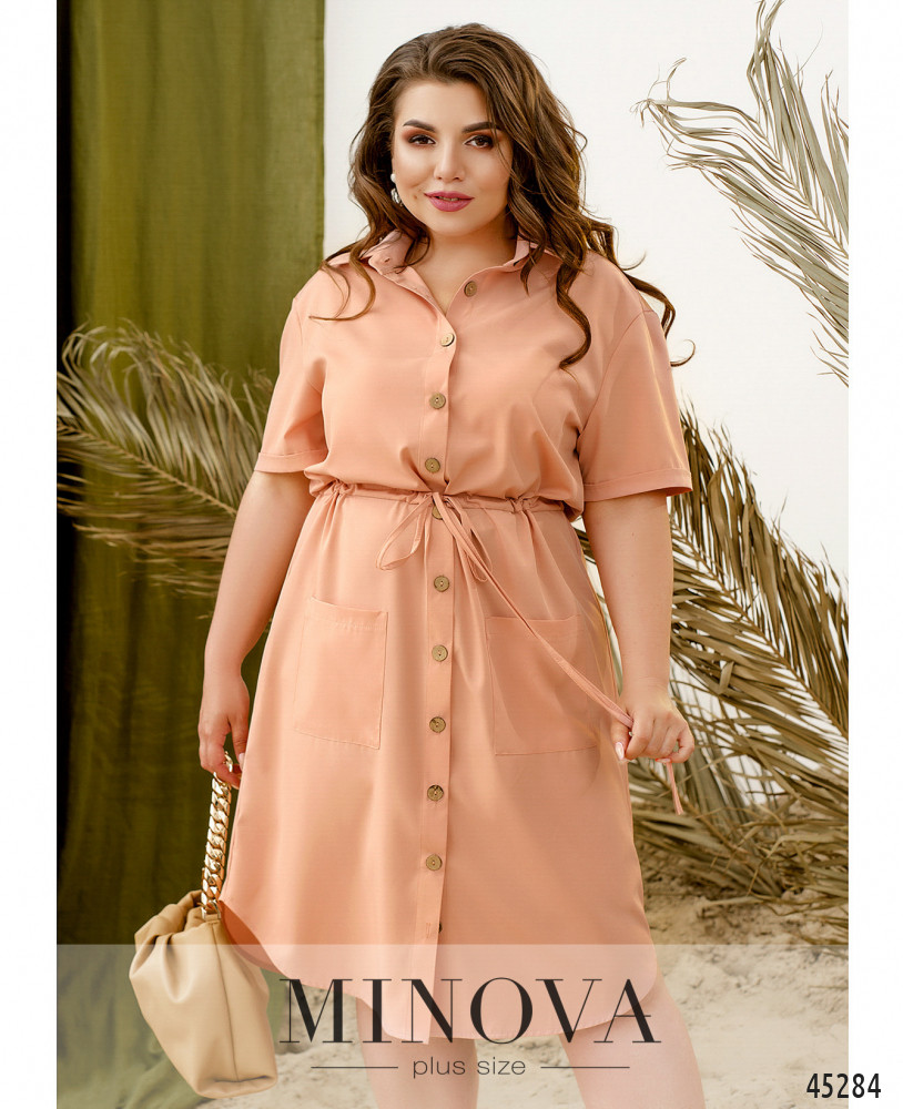 Яркое платье батал с короткими рукавами-оборками, застёжка - ряд пуговиц спереди на планке. Подол с длинными оборками. По бокам - карманы в шве. Через талию под кулиской пропущен шнурок.