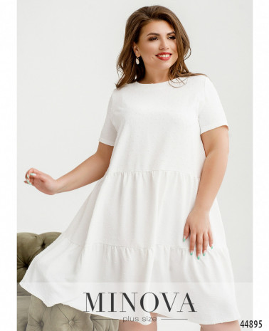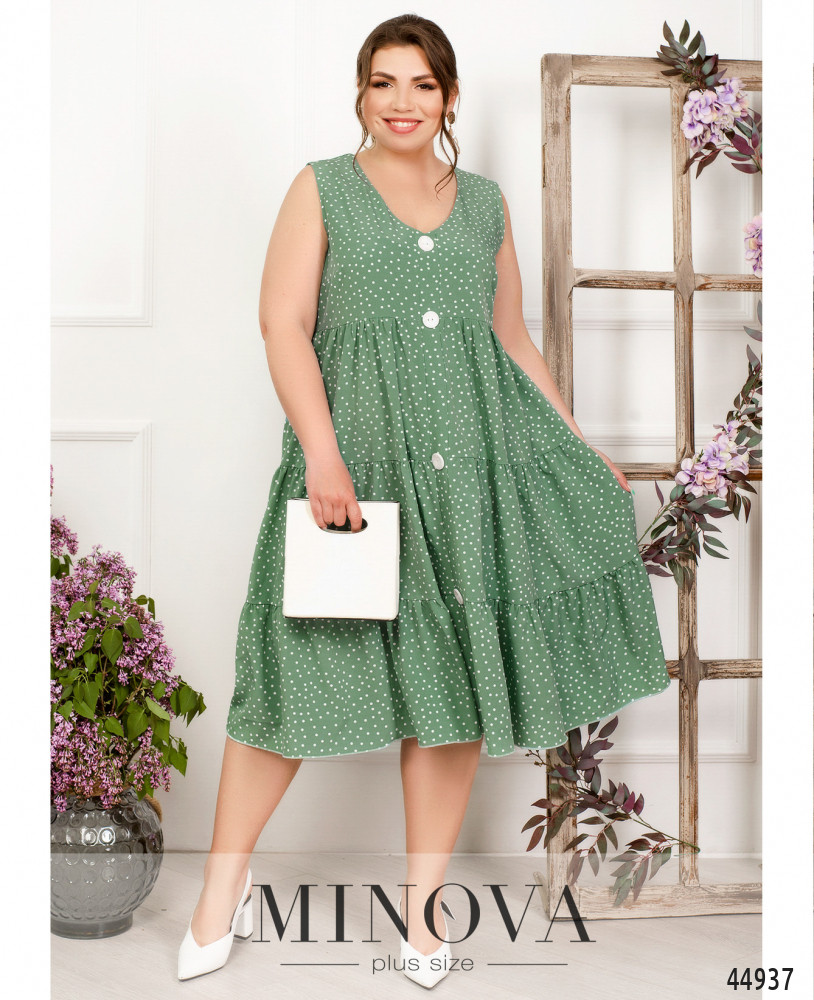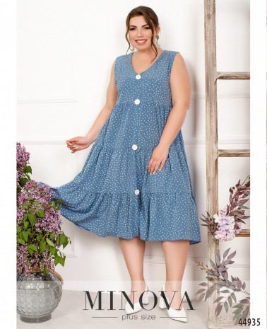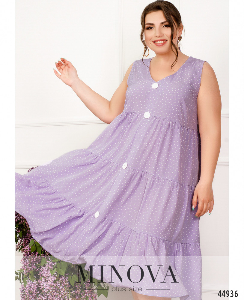 Женственное платье батал без рукавов, вырез горловины полукруглый, на подоле - мягкие оборки. По бокам карманы в шве. Застёжек нет.