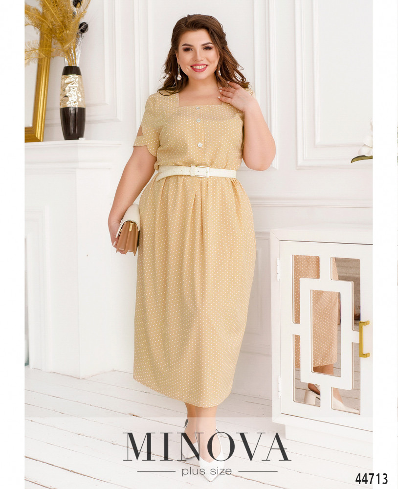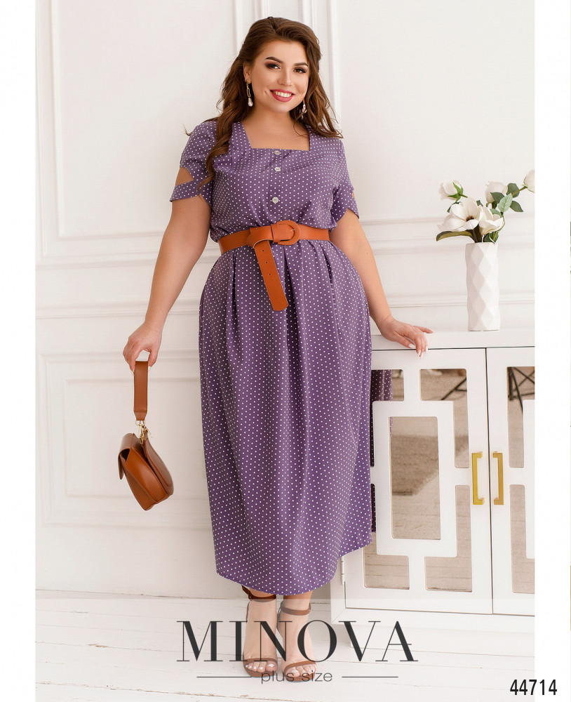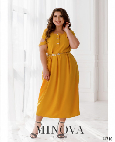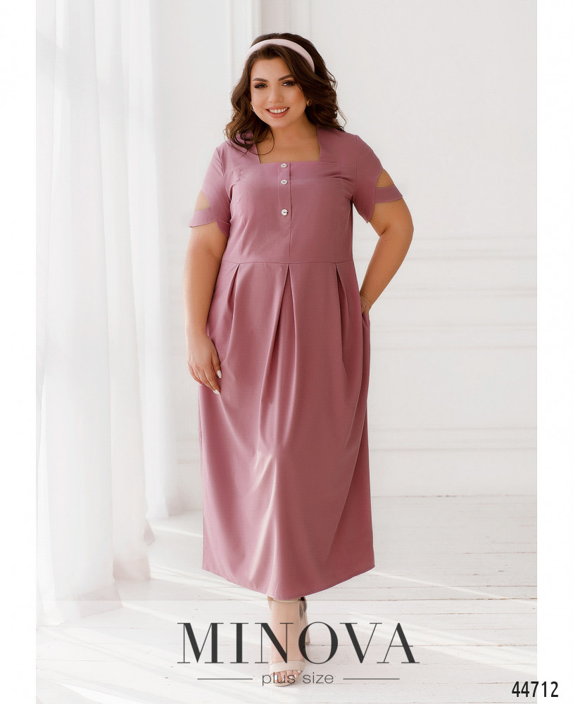 Изысканное минималистичное платье батал с вырезом горловины "каре". Подол отрезной, ткань на подоле присобрана, на талии вытачки. По бокам - карманы в шве. Застёжка - вшитая по спинке молния, на лифе до талии - декоративные пуговицы. Рукава с округлым вырезом.