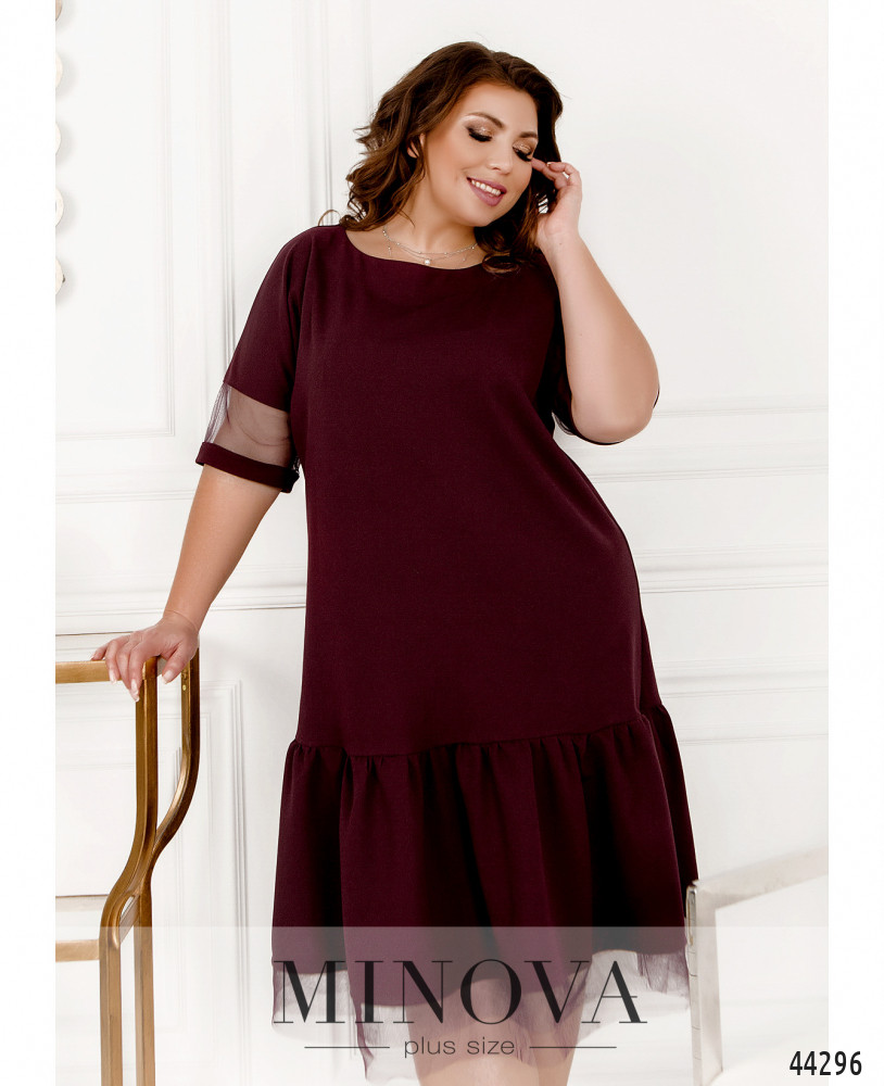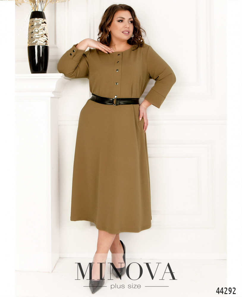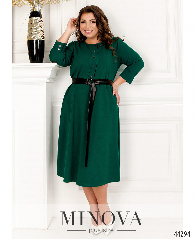Романтичное платье-рубашка большого размера с поясом в тон, воротничок - небольшая стоечка. Застёгивается на ряд пуговиц спереди на планке, от воротничка до низу. Рукава с удлинёнными манжетами, на манжетах по одной пуговке. Верх украшен ажурным кружевом спереди и по спинке. Карманов нет.