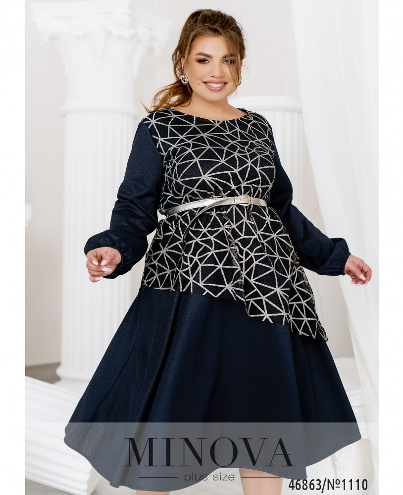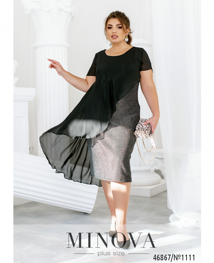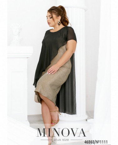 Елегантна сукня з двошаровим ліфом, ідеально сідає по фігурі, незалежно від її особливостей. Верхня частина ліфа - асиметрична і сяюча, а нижня частина, рукава і поділ виконані з однотонної тканини. Модель без кишень доповнена довгими рукавами, в зап'ястя яких вшиті резинки. Сукня застібається на маленьку гудзик ззаду під шиєю.