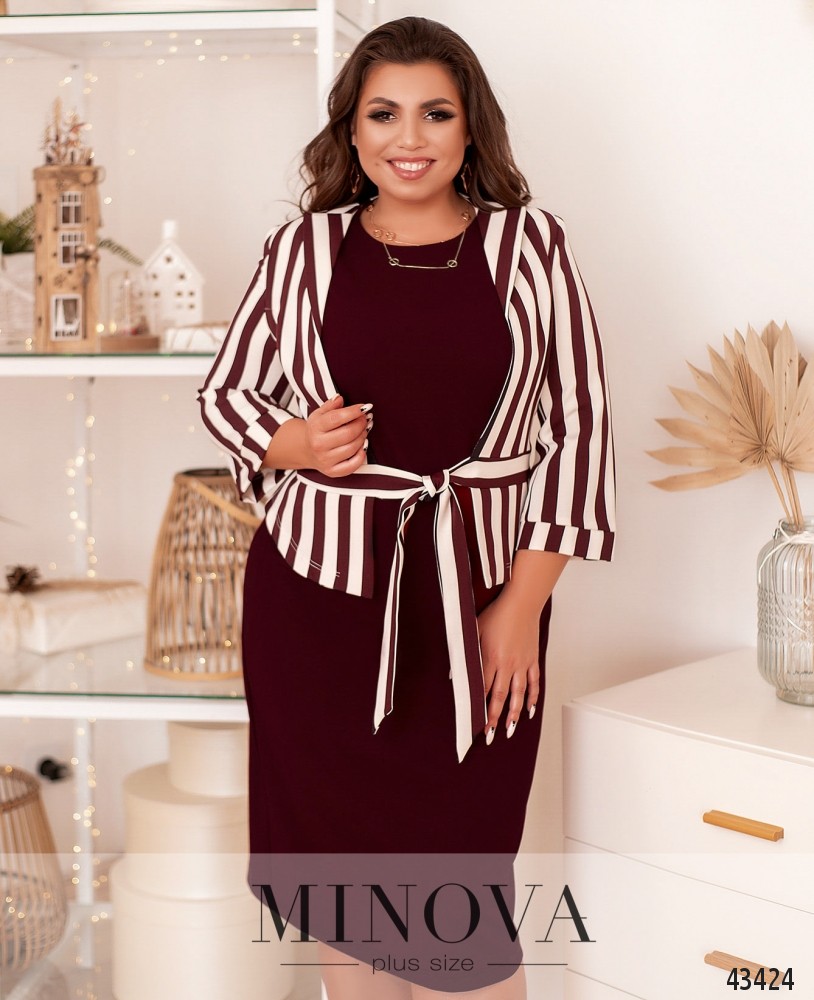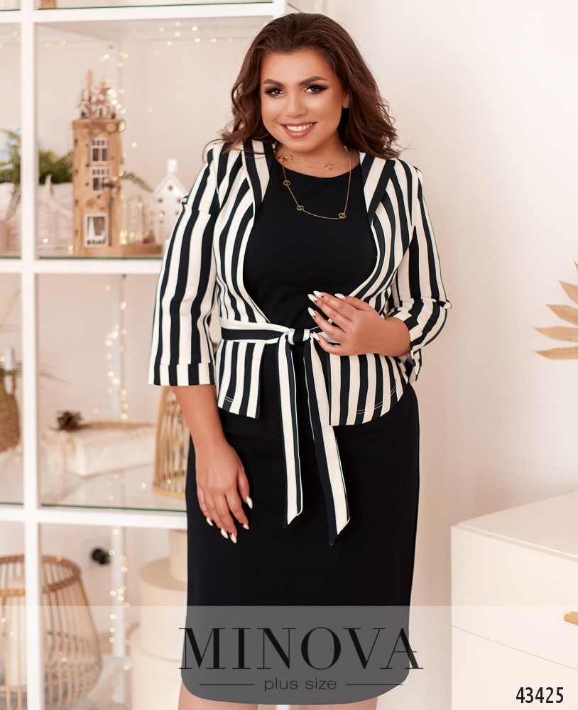 Чепурний костюм великого розміру з жакетом та сукнею. Cукня без рукавів, без кишень та застібок, виріз горловини півкруглий, ззаду на подолі шліца. Жакет без підкладки, з підплічниками, без застібок та кишень, зав'язується на стрічки спереду. Відвороти невеликі, рукава з м'якими манжетами без гудзиків.