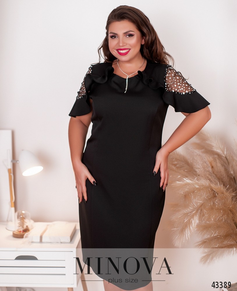 Романтична сукня великого розміру з оборками на грудях, рукавах та спинці. Спереду та на спині - повздовжні виточки, силует приталений. Рукава з напівпрозорої сіточки з зірками. Застібка - блискавка, вшита по спинці. Кишень немає.
