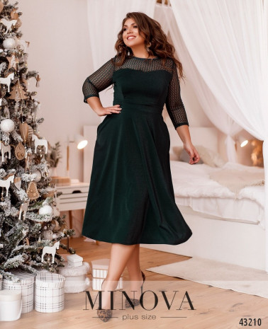 Елегантна сукня батал з мереживним верхом та рукавами, рукава без манжетів. Виріз щільної тканини в формі фігурного каре, виріз кружевної частини - півкруглий. Поділ підшитий до ліфу та відділений полосою "пояска". Тканина з люрексом, застібка - блискавка, вшита по спинці, з обох боків - прорізні кишені. На грудях повздовжні виточки.