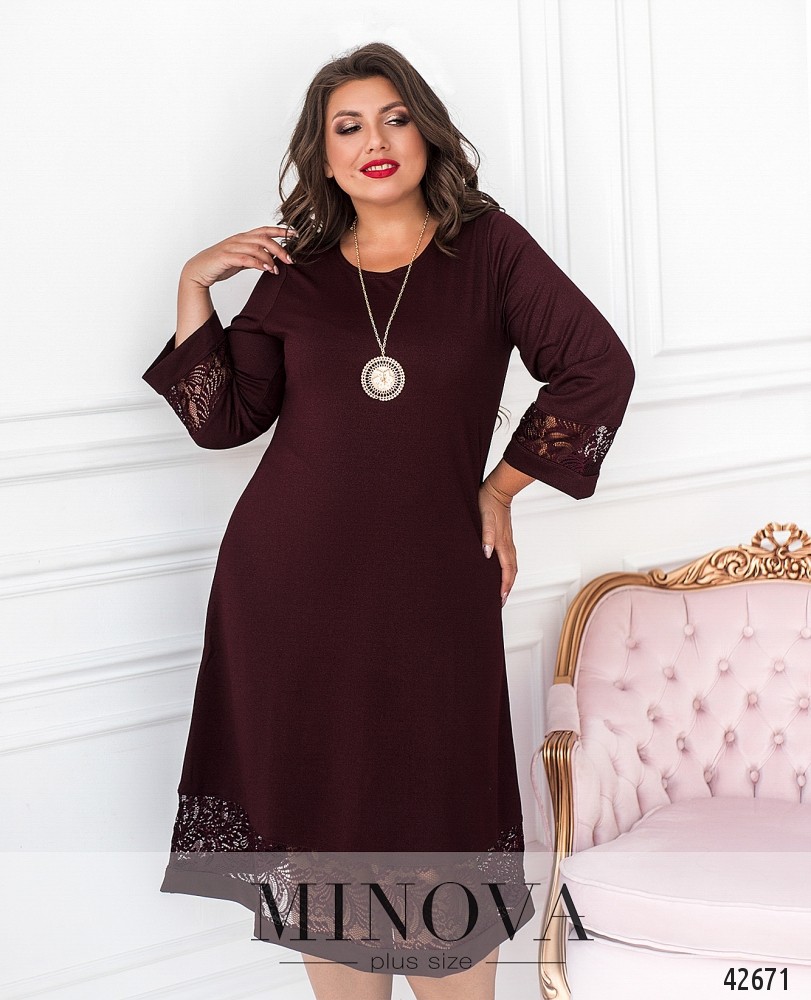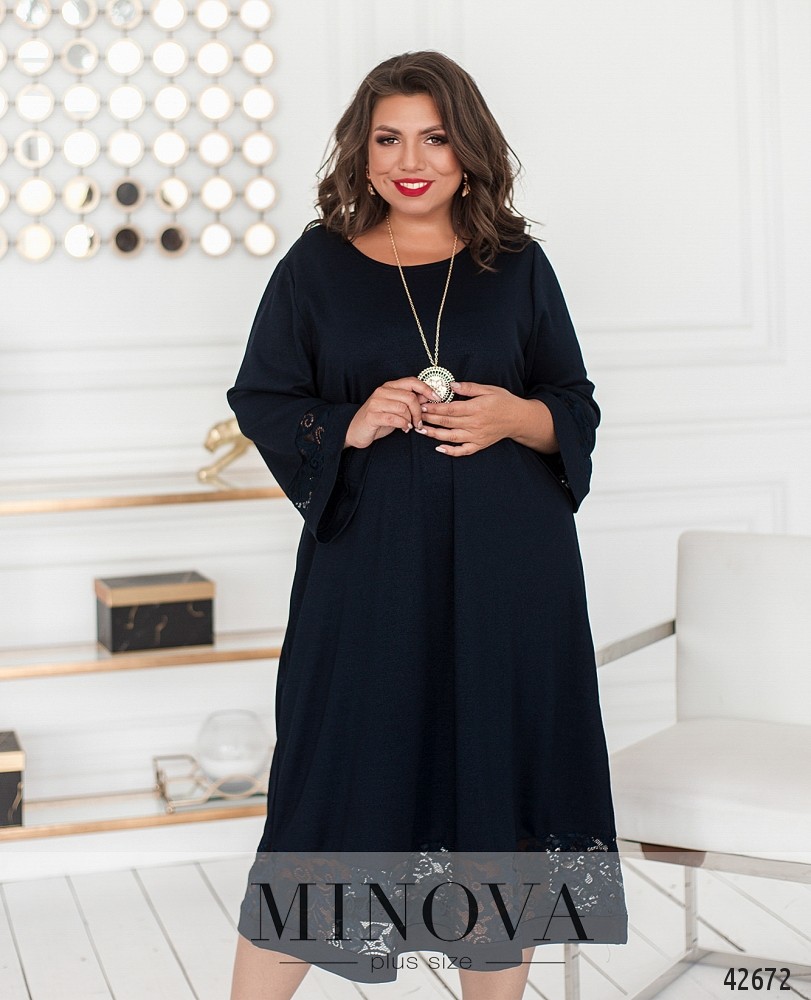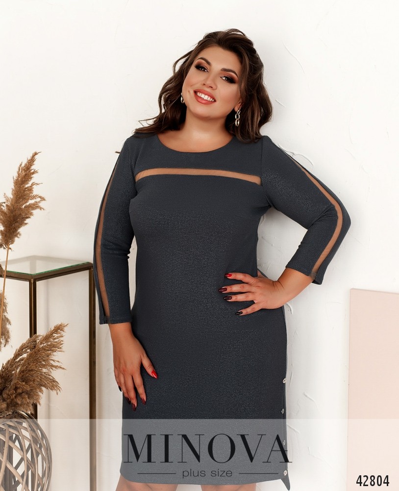 Оригінальна сукня батал з контрастними рукавами та горловиною. На рукавах - м'які манжети без гудзиків. Застібок немає, з обох боків - прорізні кишені.