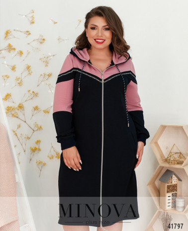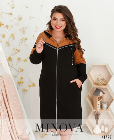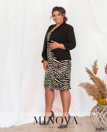 Нарядное платье батал с жакетом. Платье из оригинальной, приятной ткани с анималистичным принтом и небольшими блёстками. Застёгивается на молнию, вшитую по спинке, имеет нижний мягкий слой. На спине под шеей - круглый вырез. Жакет с подплечниками, без подкладки, без застёжек и карманов, рукава с небольшими отворотами.