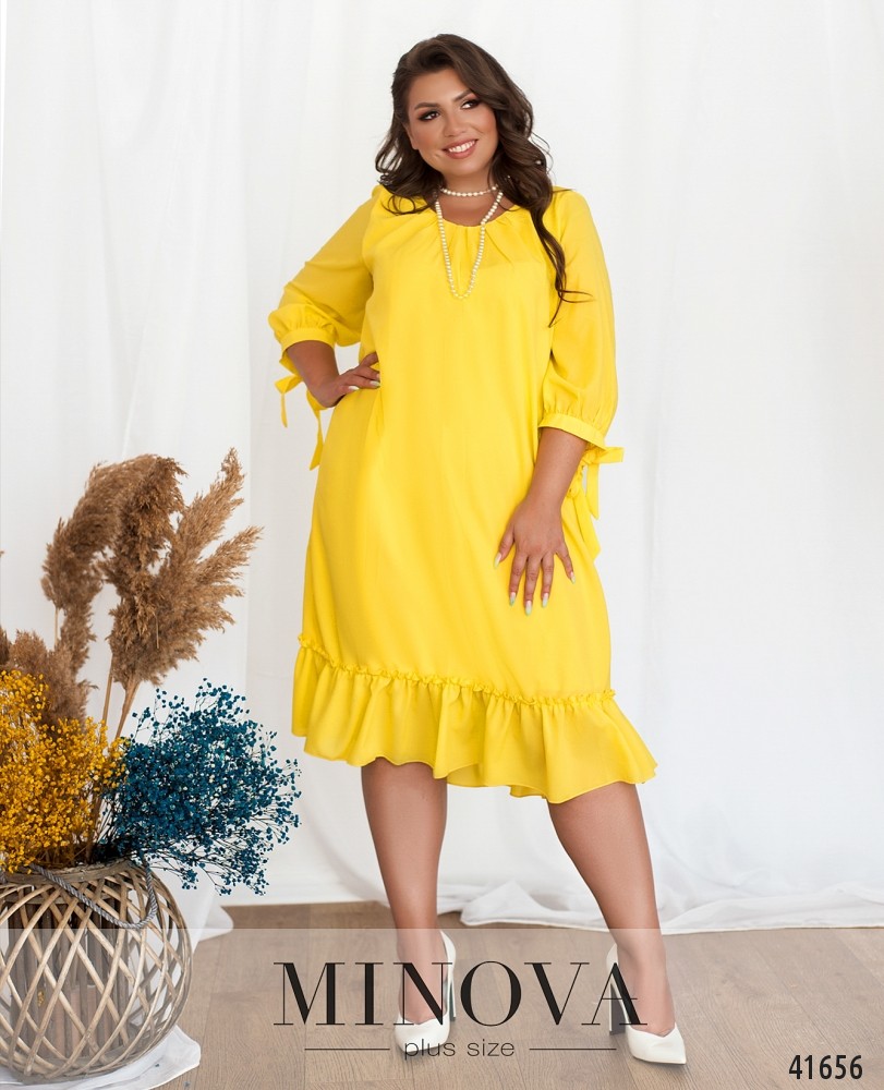 Елегантна сукня батал з декоративними гудзиками на рукавах. Виріз горловини неглибокий, півкруглий. Тканина від вирізу спадає оборками. Силует приталений, з обох боків - прорізні кишені. Застібається на блискавку, вшиту по спинці.