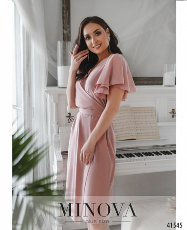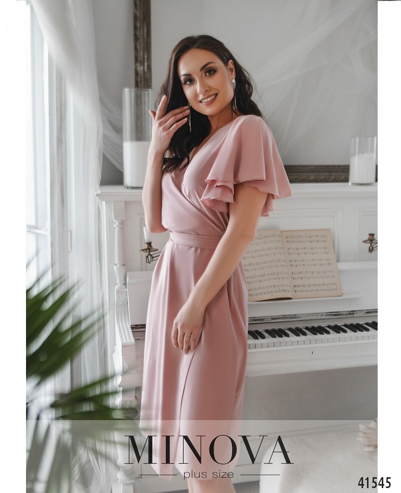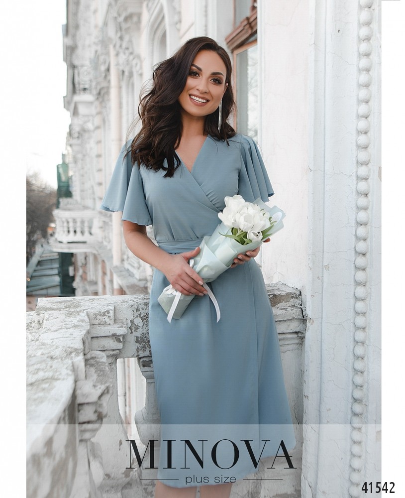 Романтична сукня батал без декора, з рукавами-крильцями. Зав'язується на запин, поясок протягується в проріз збоку на поясі. Кишень та застібок немає, підкладки немає. На грудях виточки.